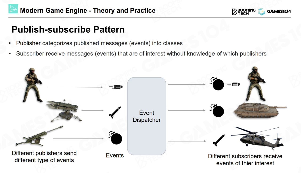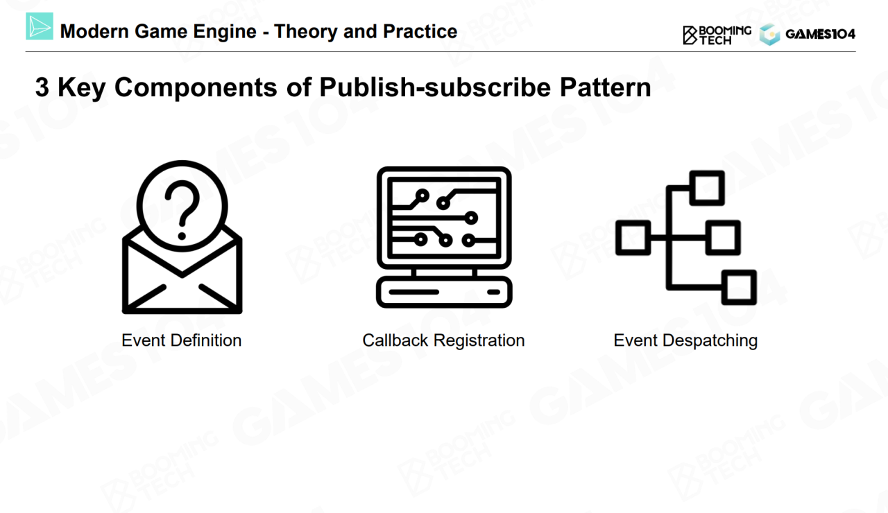 在游戏引擎中一般会使用publish-subscribe这样的模式来实现具体的通信过程。在publish-subscribe模式中每个GO有着自己的publish功能来向其它GO发送事件,同时自身的subscribe功能来实现接收事件以及相应的反馈。当然在publish-subscribe模式中还需要一个event dispatcher来执行高效的事件派送。因此在publish-subscribe模式中的三要素为事件定义(event definition)、注册回调(callback registration)以及事件派送(event dispatching)。