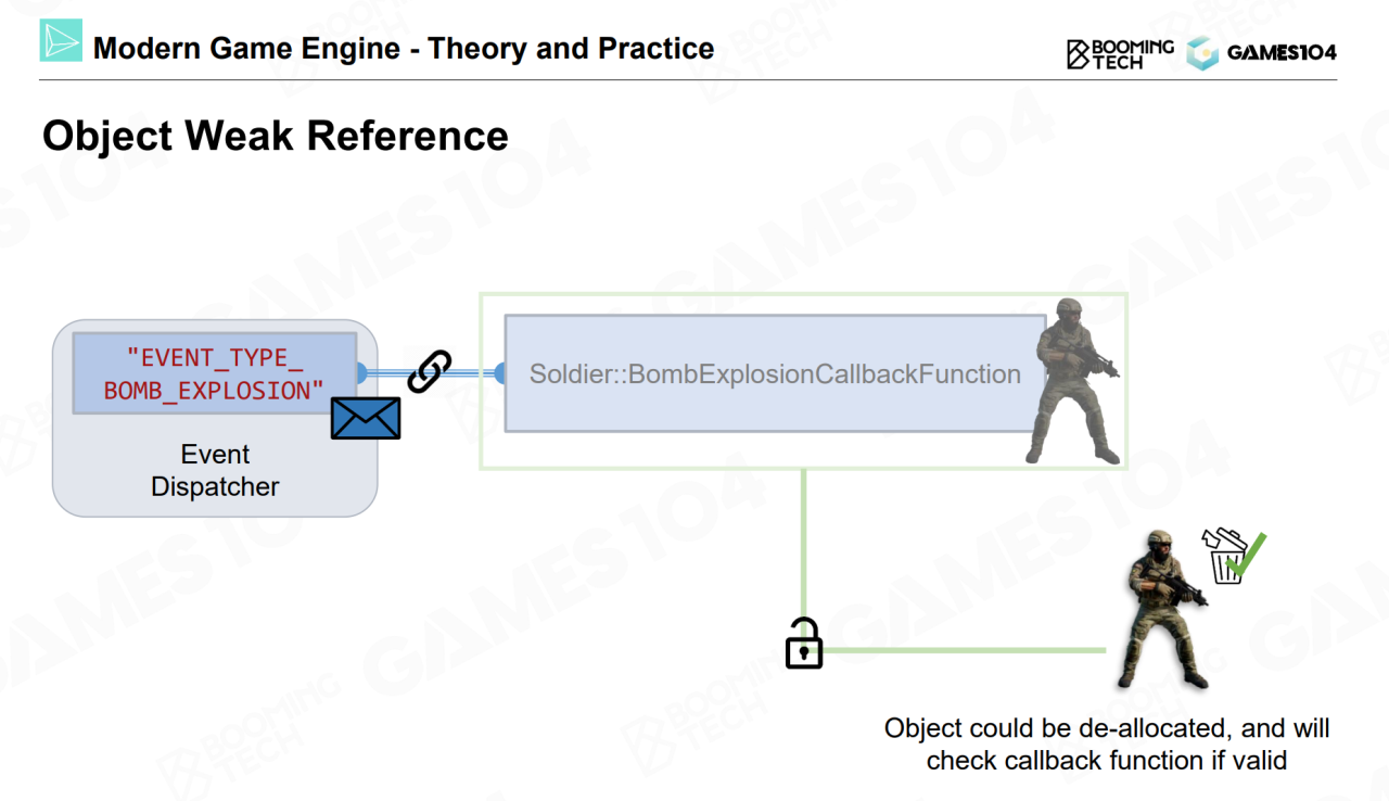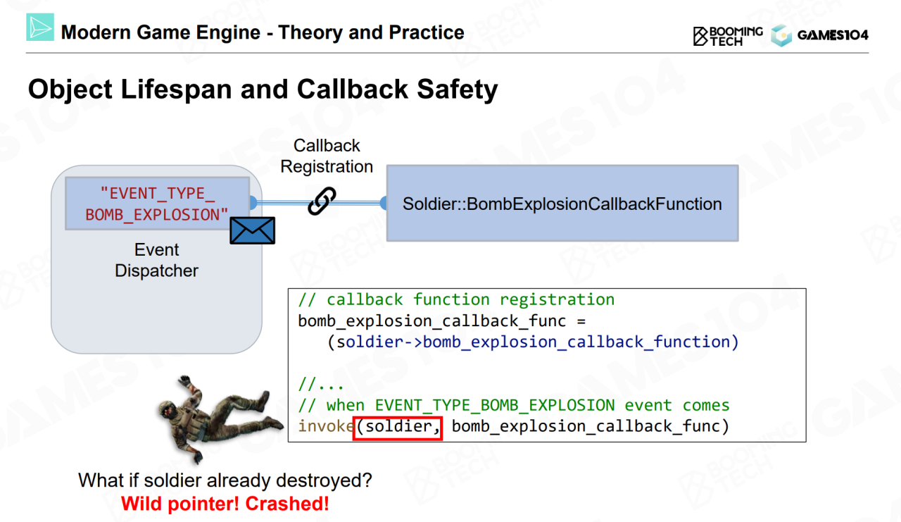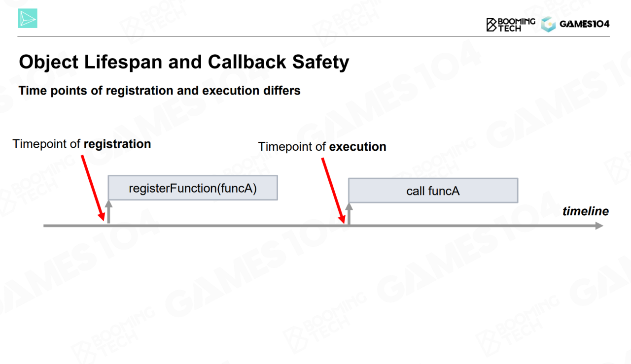 回调函数的一大特点在于它的注册和执行往往是分开的。这一特点可能会导致回调函数调用时相关的一些GO可能已经结束了生命周期,因此回调函数的安全性是整个事件系统的一大难题。