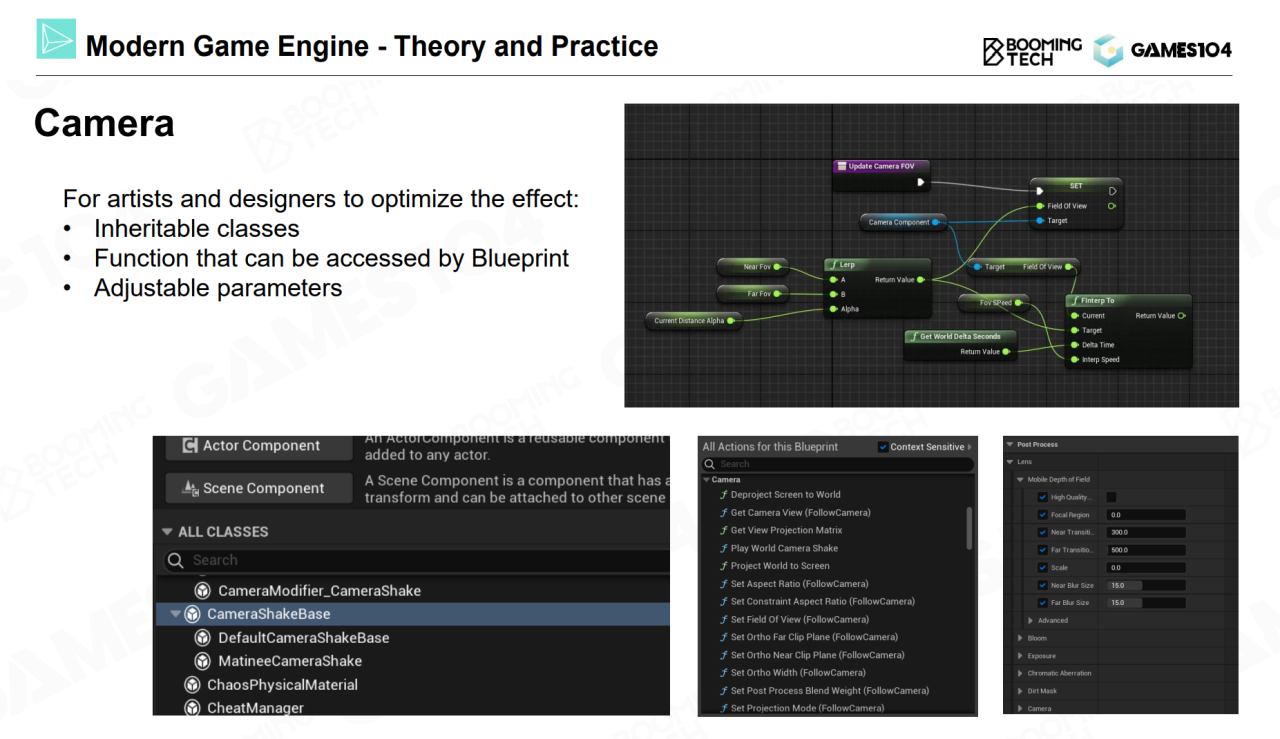 因此游戏引擎中的镜头系统需要允许用户使用脚本或是可视化脚本来编辑相机的各种属性和参数。