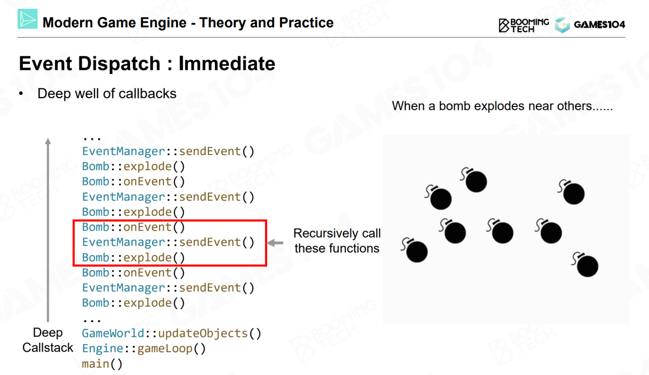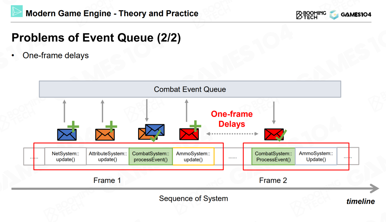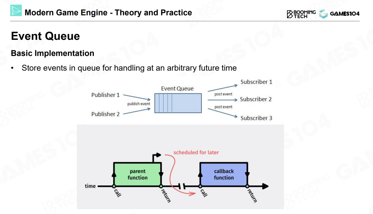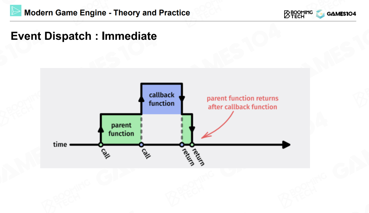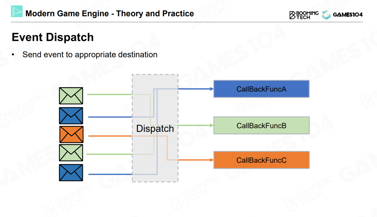现代游戏引擎中更常用的分发方式是使用事件队列(event queue)来收集当前帧上所有的事件,然后在下一帧再进行分发和处理。