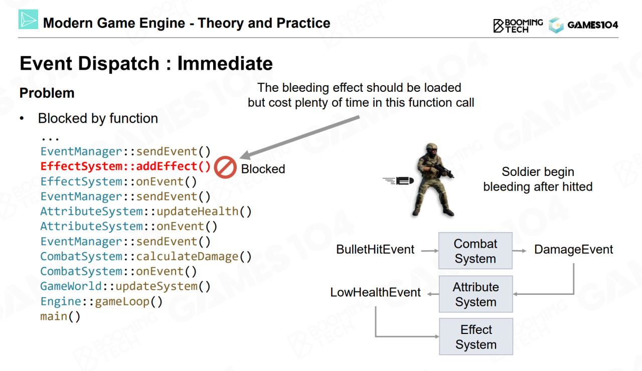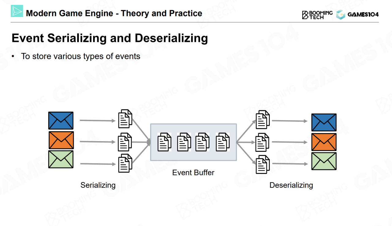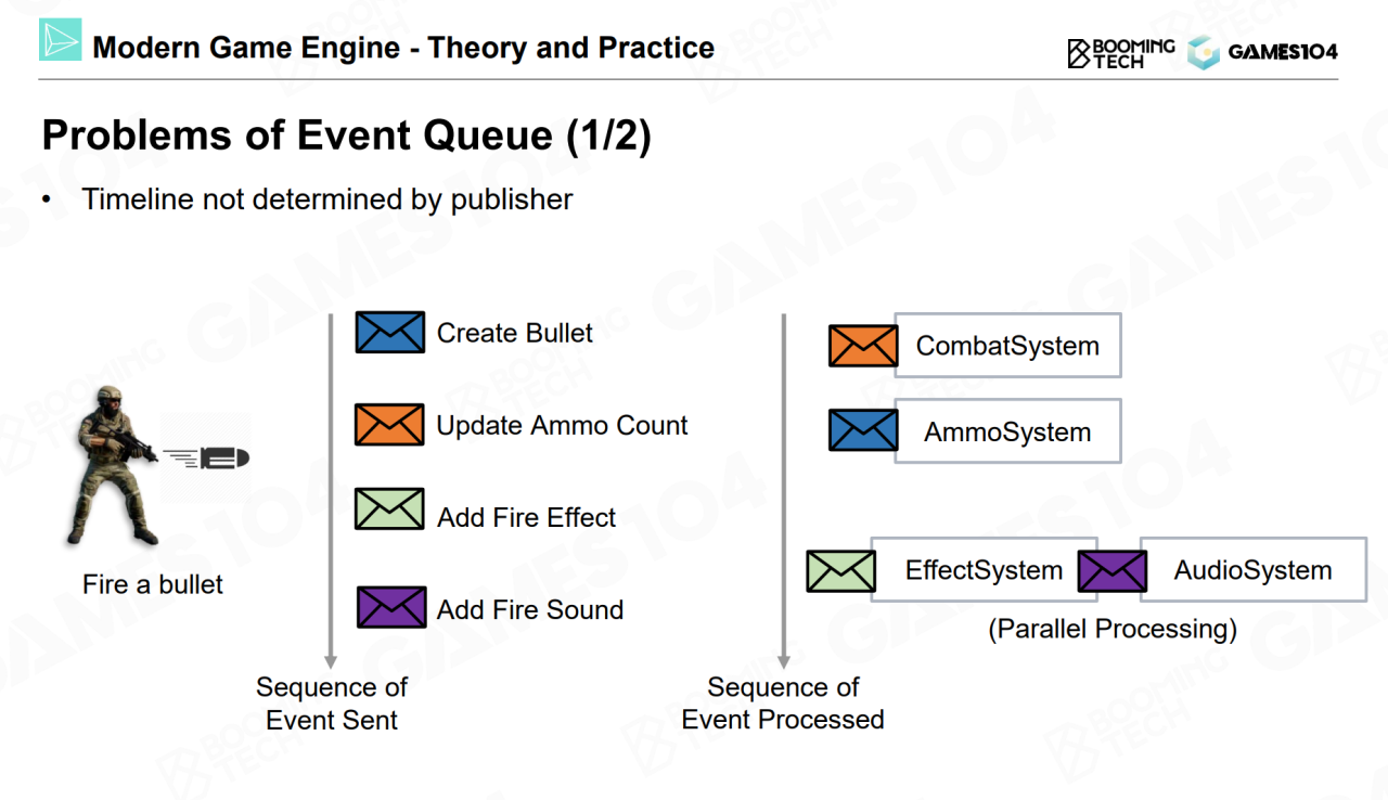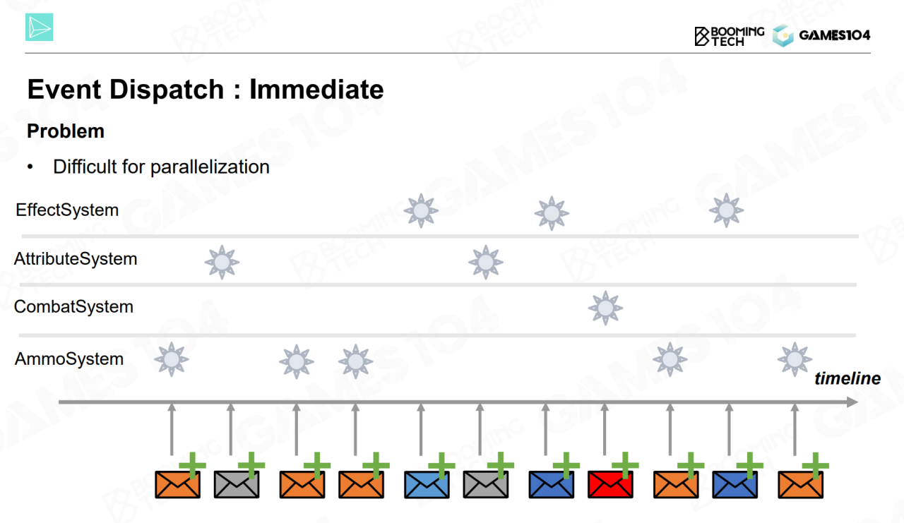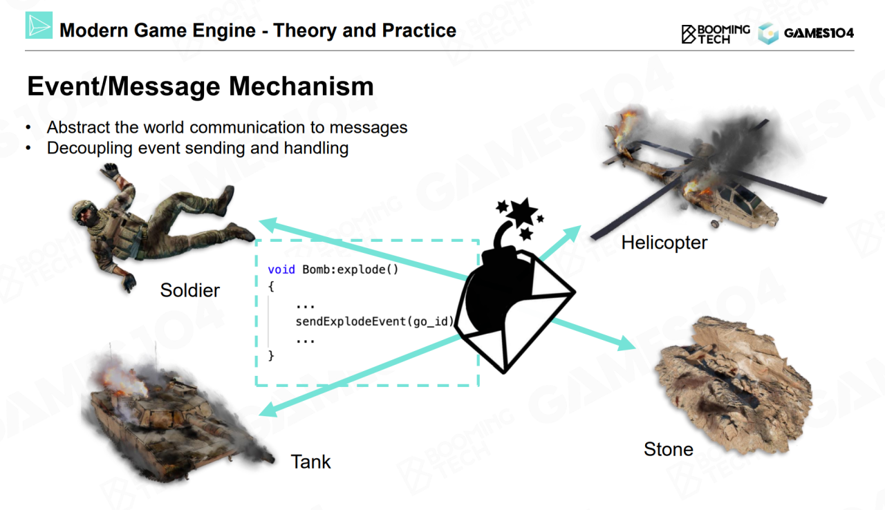 现代游戏引擎中更常用的分发方式是使用事件队列(event queue)来收集当前帧上所有的事件,然后在下一帧再进行分发和处理。