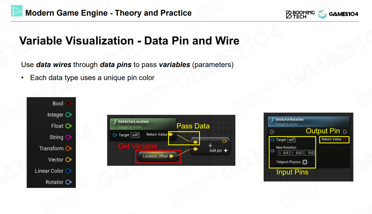 以虚幻引擎的blueprint功能为例,每个变量需要封装数据类型以及作用域两种属性。而在可视化脚本中,不同类型的数据会使用不同的颜色来方便用户进行区分。