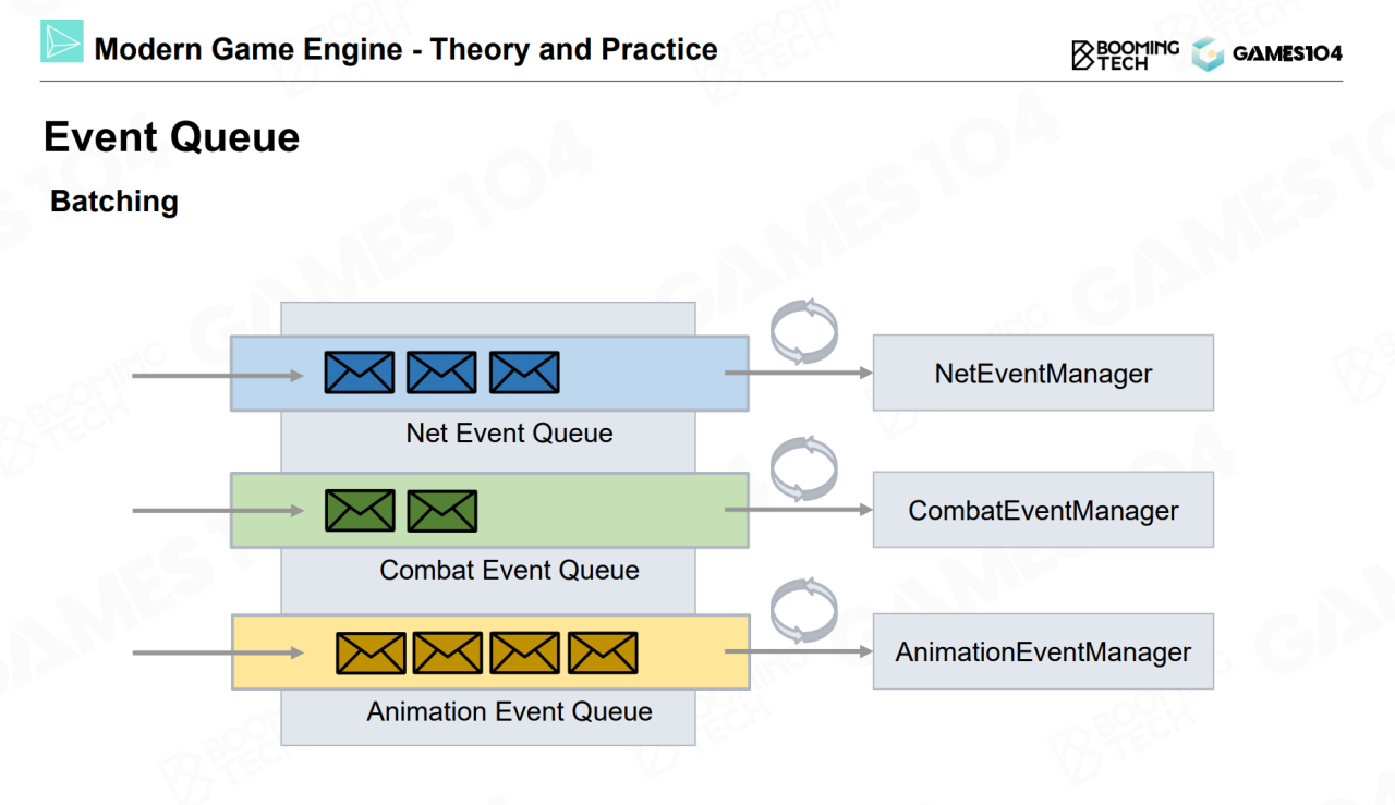 现代游戏引擎中往往会同时有多个不同的event queue来处理不同类型的事件,每个queue用来保存一些相对独立的事件。这种方式可以便于我们进行调试,也可以提升系统的性能。