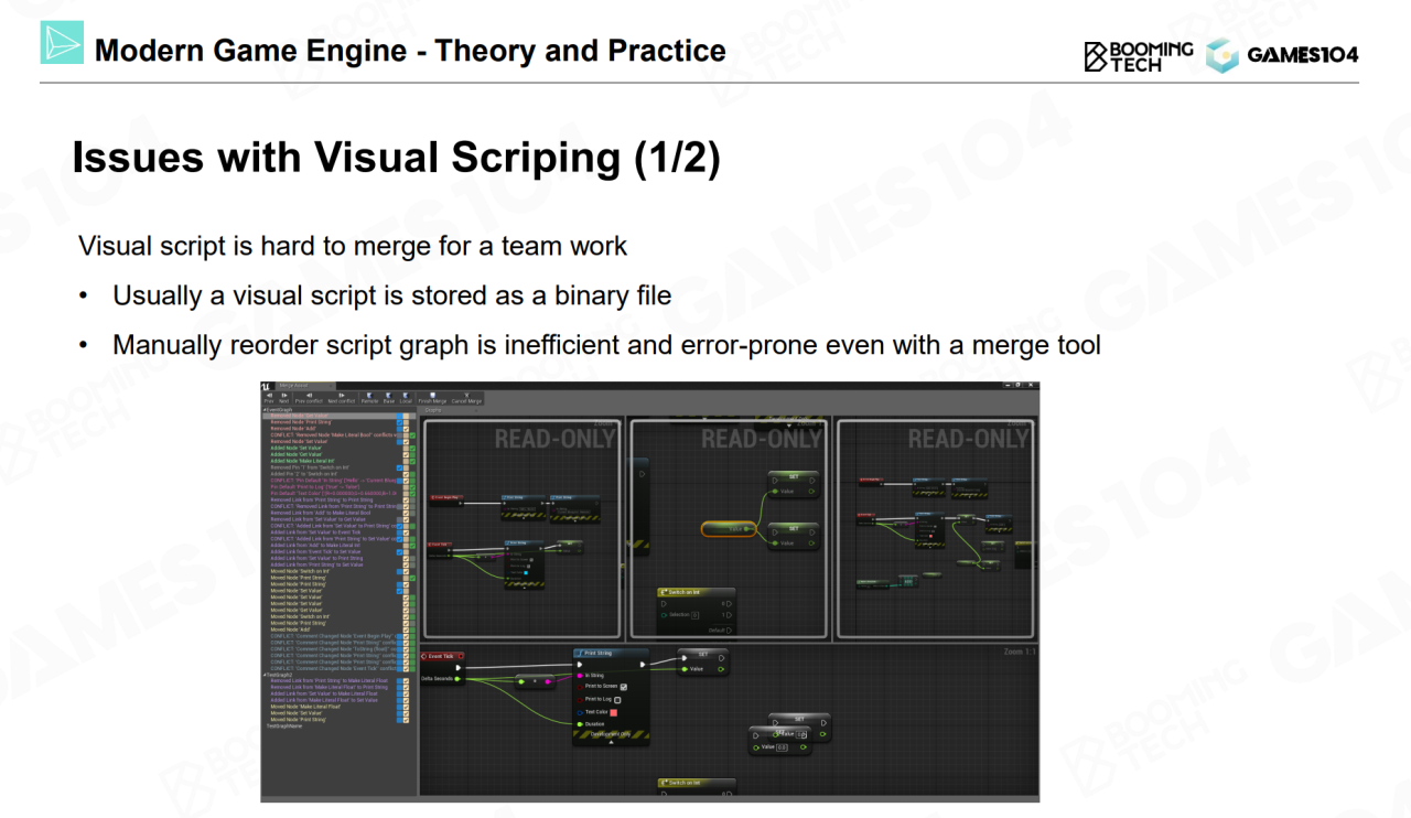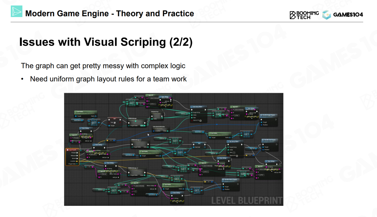 可视化脚本也有一些自身的问题。首先可视化脚本很难进行协作,在大型开发团队中很难把每个开发者定义的脚本直接组装到一起,往往需要通过大量人工的重新排序才能得到正确的结果;同时当脚本中的节点过多时整个脚本在视觉上可能会非常繁琐,让人难以阅读。
