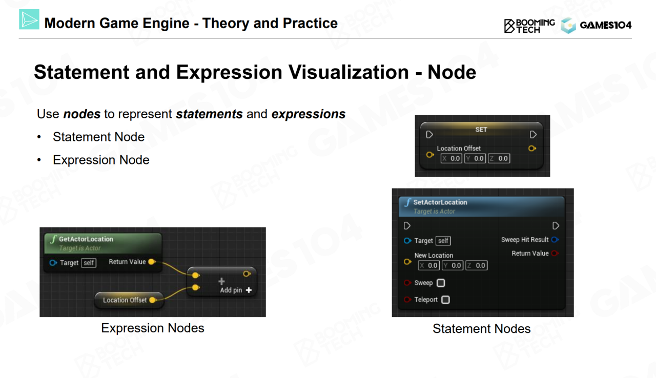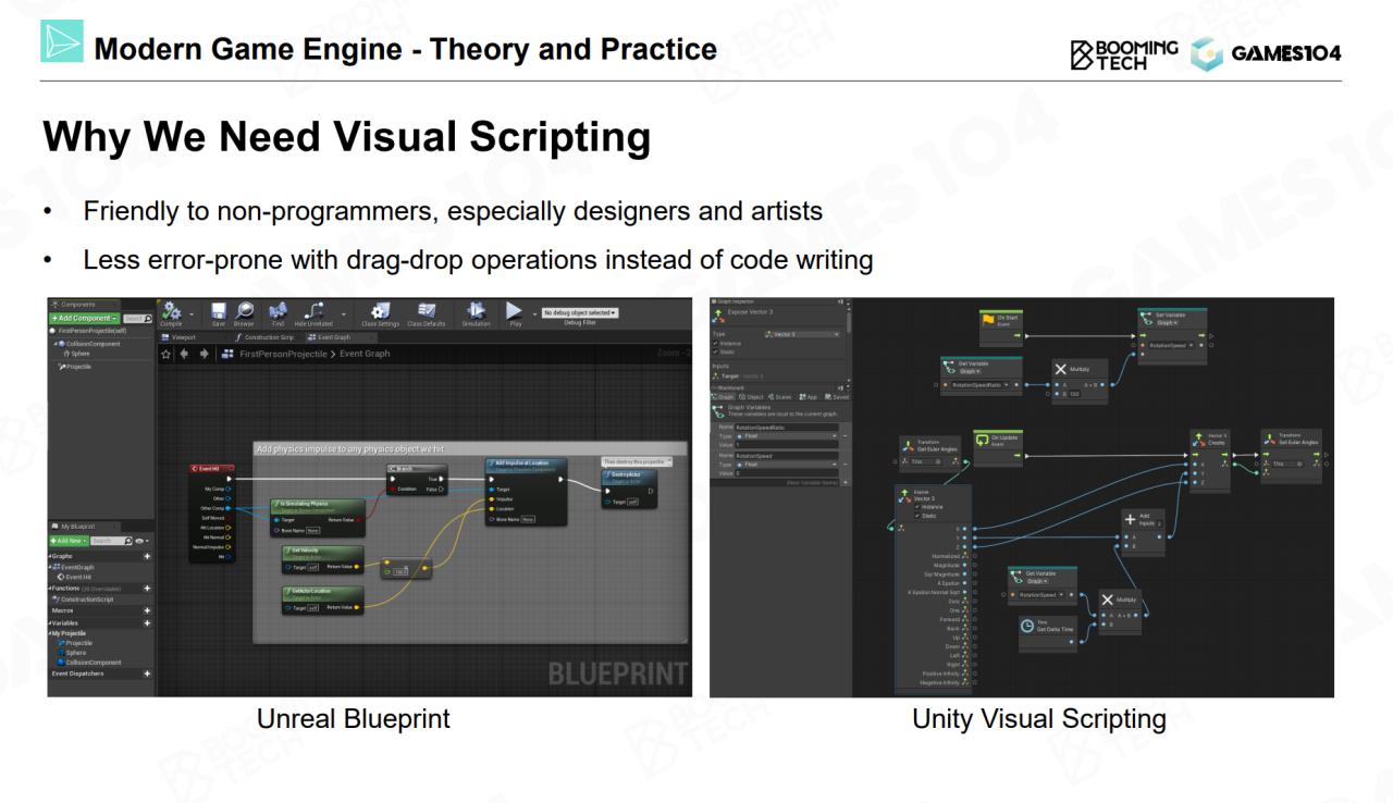 可视化脚本(visual scripting)是现代游戏引擎几乎必备的功能。和传统的脚本语言相比可视化脚本无需开发者直接进行编程,因此它对于设计师和艺术家而言更容易进行掌握。像虚幻和unity这样的商业级游戏引擎都实现了自身的可视化脚本功能。