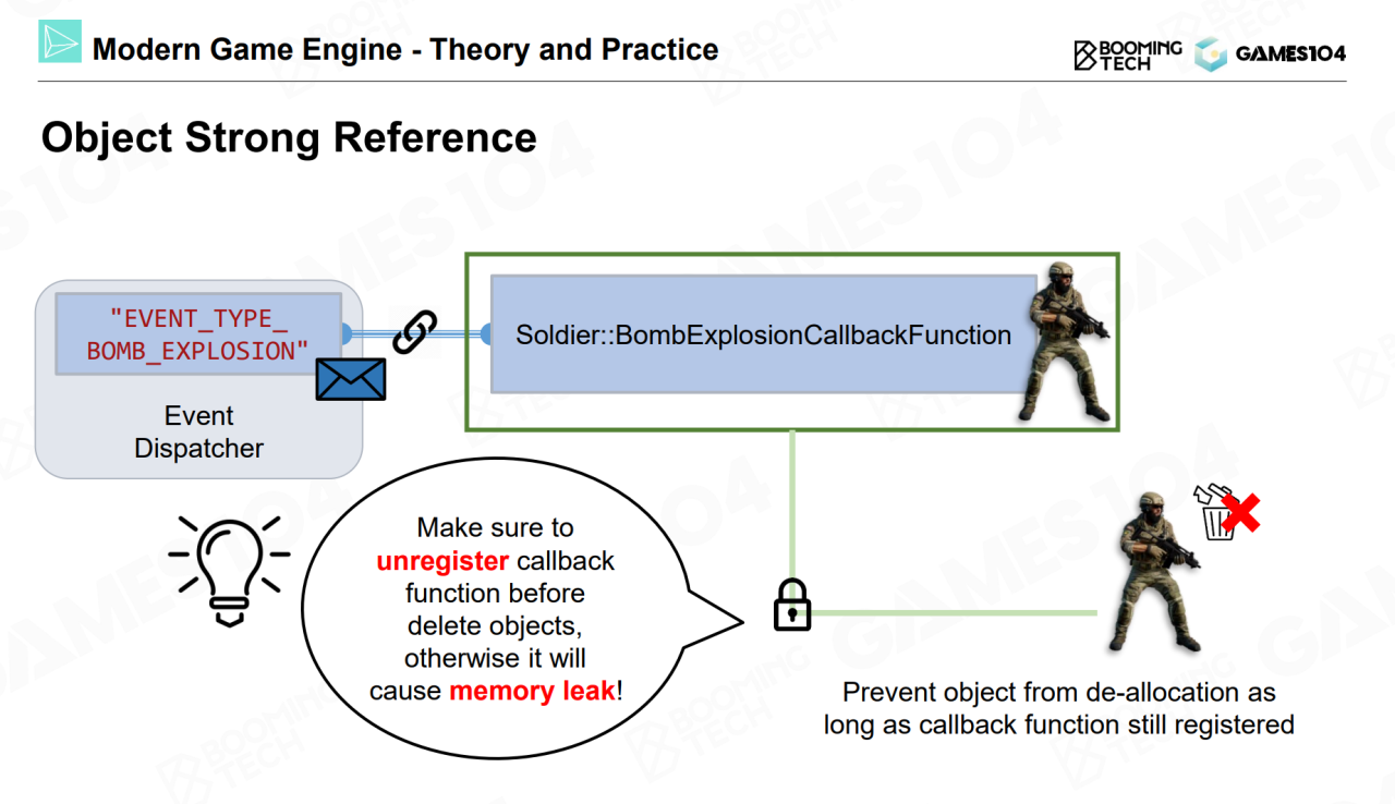 为了处理这样的问题我们可以使用强引用(strong reference)这样的机制来锁定相关GO的生命周期。强引用会保证所有和回调函数相关的资源在回调函数调用前不会被回收,从而确保系统的安全。