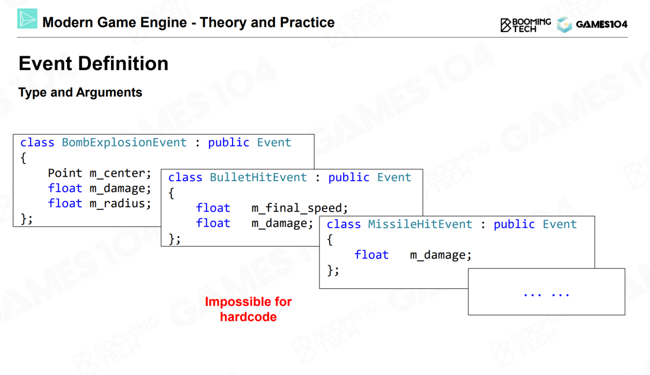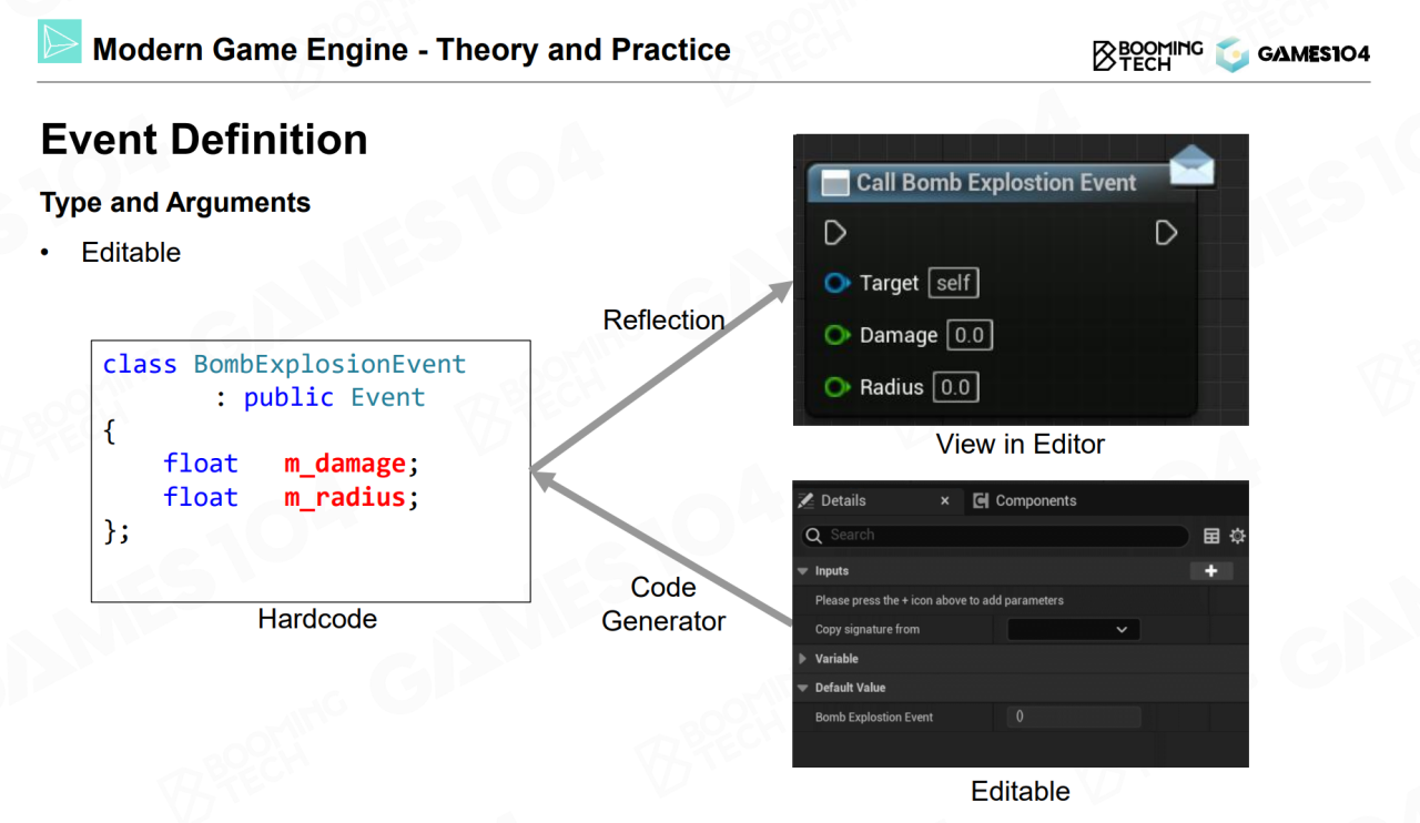 在现代游戏引擎中会使用反射和代码渲染的方式来允许设计师自定义事件类型和相关的数据。