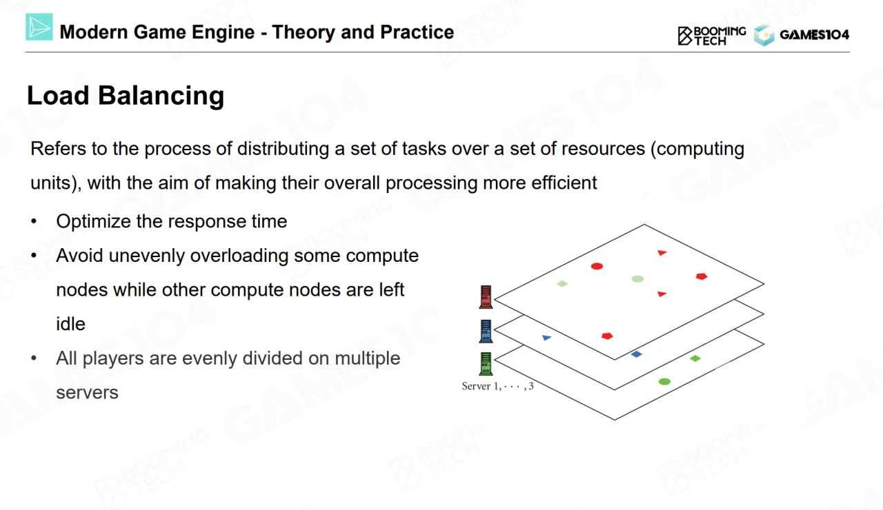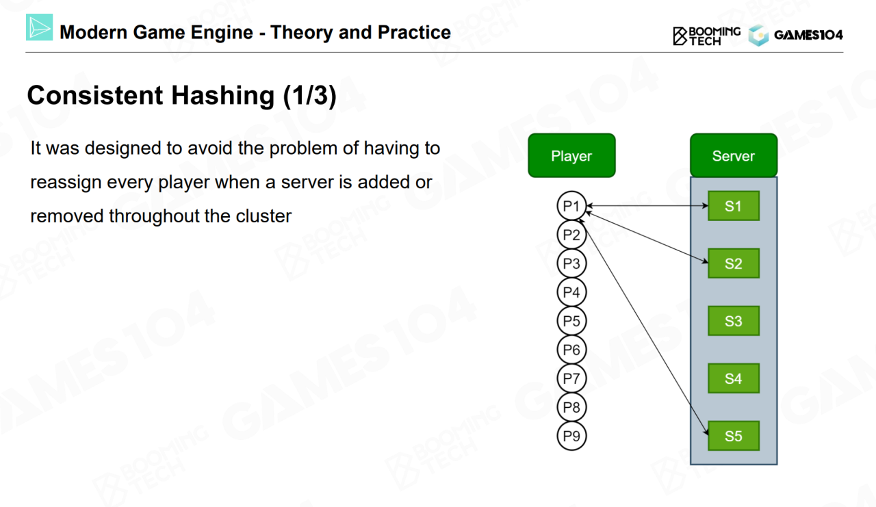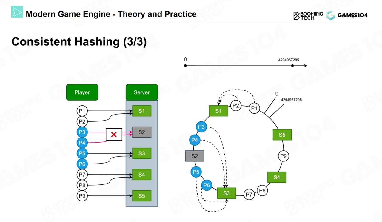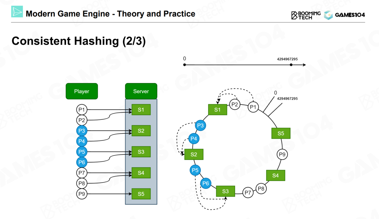 consistent hashing是实现负载均衡的经典技术。它的核心在于为服务器以及玩家设计对应的hashing算法,然后把服务器和玩家映射到一个环上,当玩家需要连接服务器时只需要利用hashing值寻找最近的服务器即可。当某个服务器从圆环上删除时只需要把玩家连接到下一个服务器上即可,类似地添加新的服务器只需要在圆环上添加新的节点。