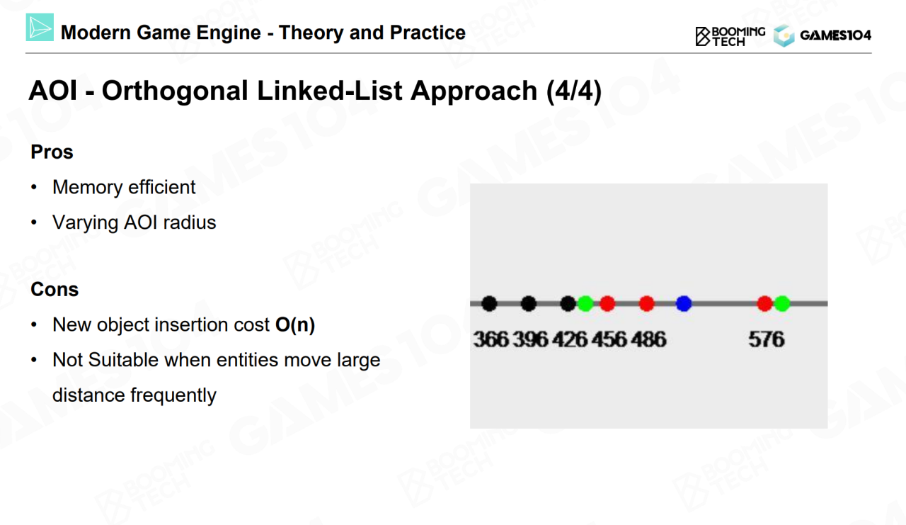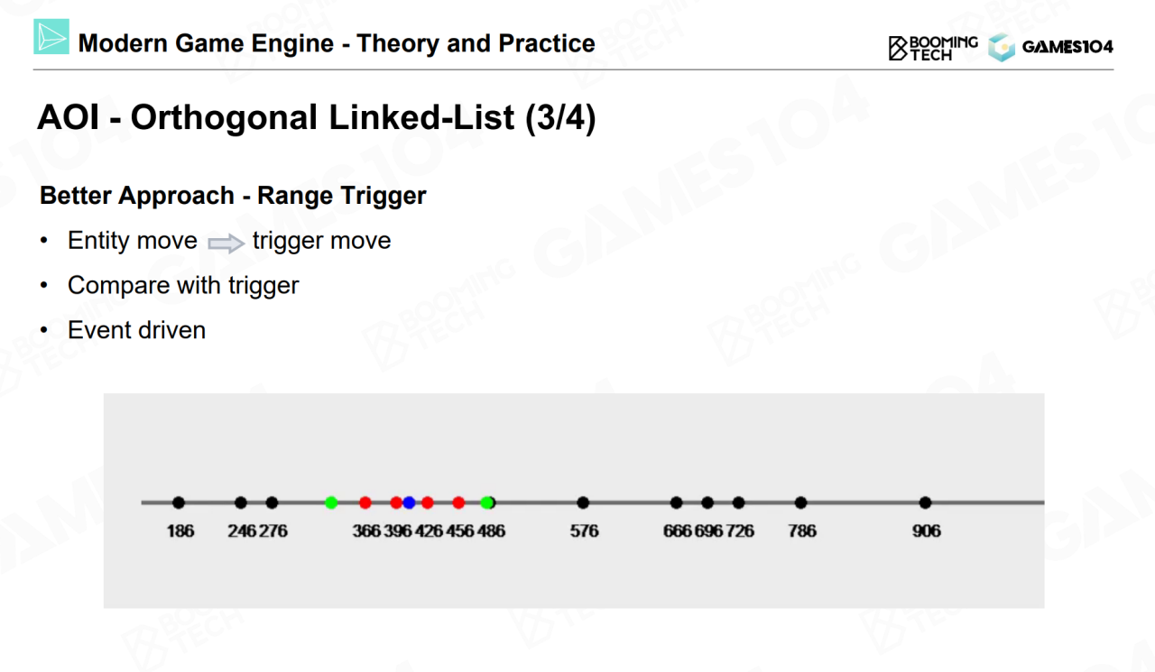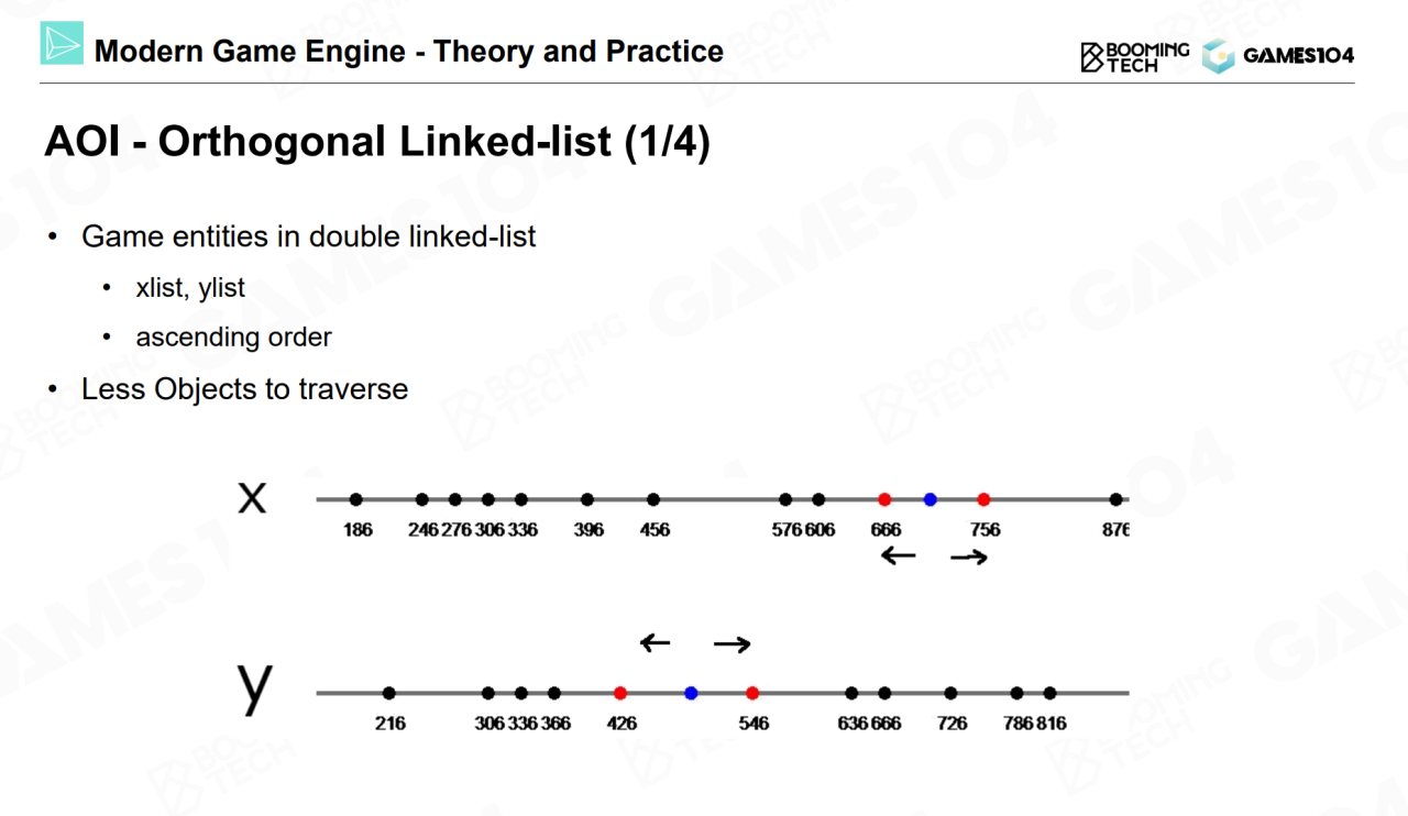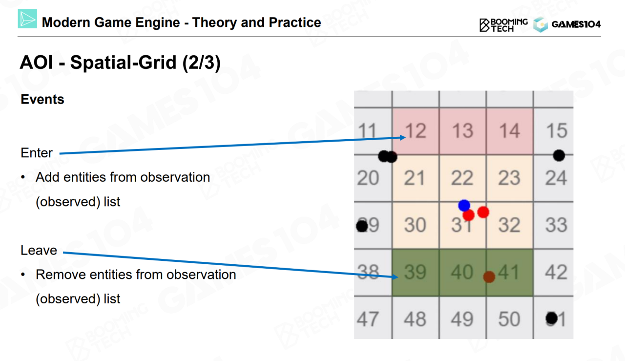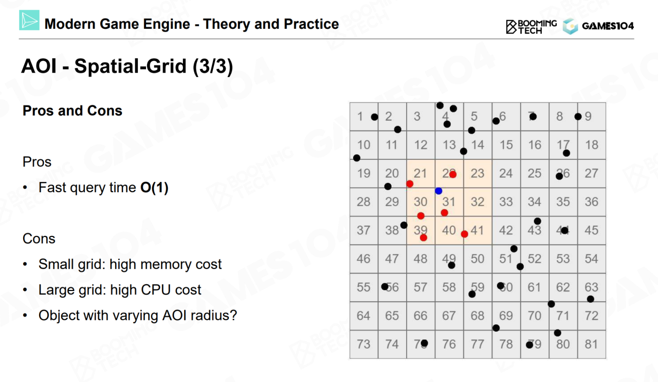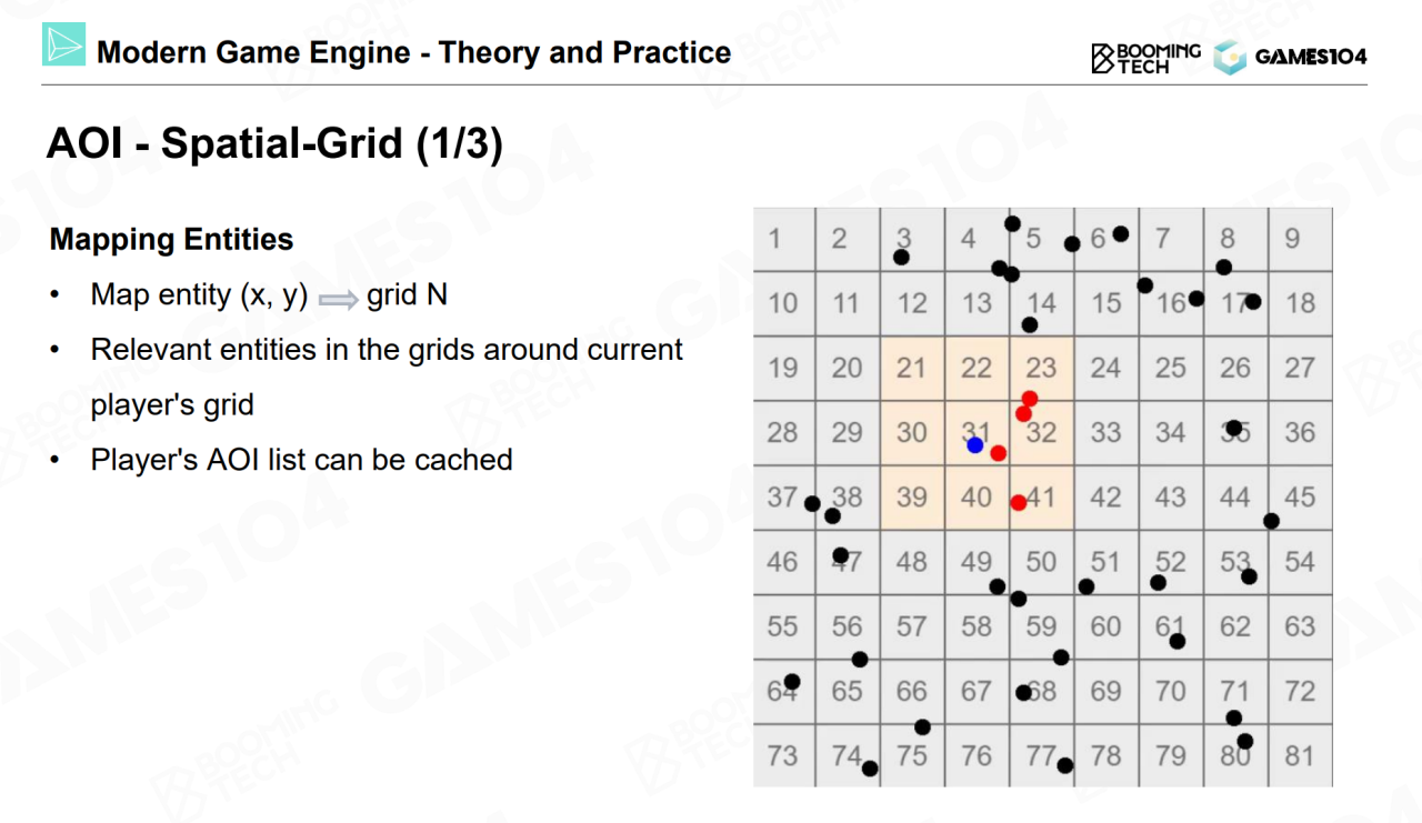 在一些开放世界游戏中我们不希望出现区域的划分,此时则可以利用area of inerest (AOI)的概念。AOI的意义在于我们只需要关注玩家附近的情况而无需考虑更远区域的信息。