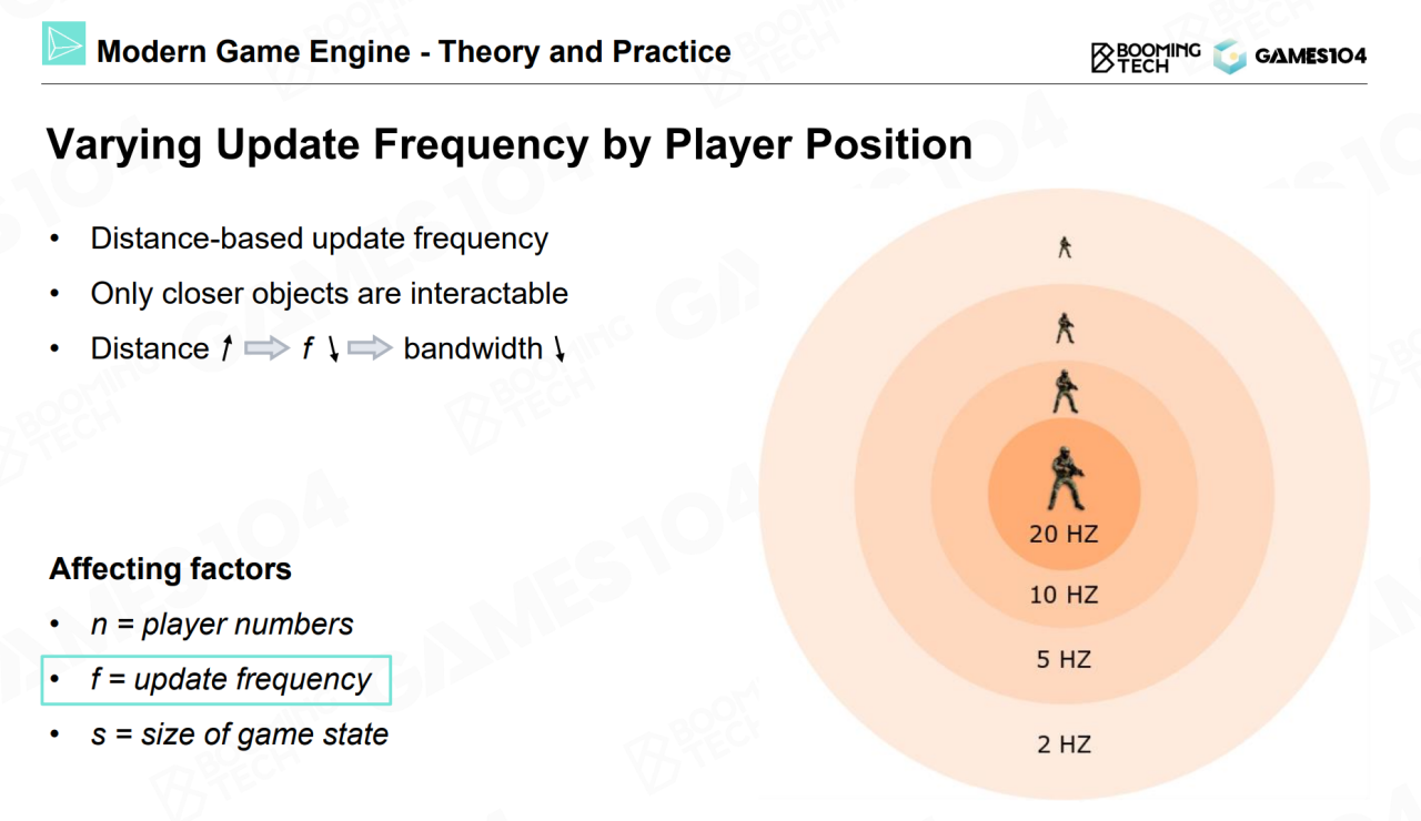 除了上面介绍的方法我们也可以通过调整更新频率的方式来降低带宽。一种经典的策略是根据物体和玩家之间的距离来设置更新频率,使得距离玩家远的物体更新得慢一些,距离近的更新得快一些。