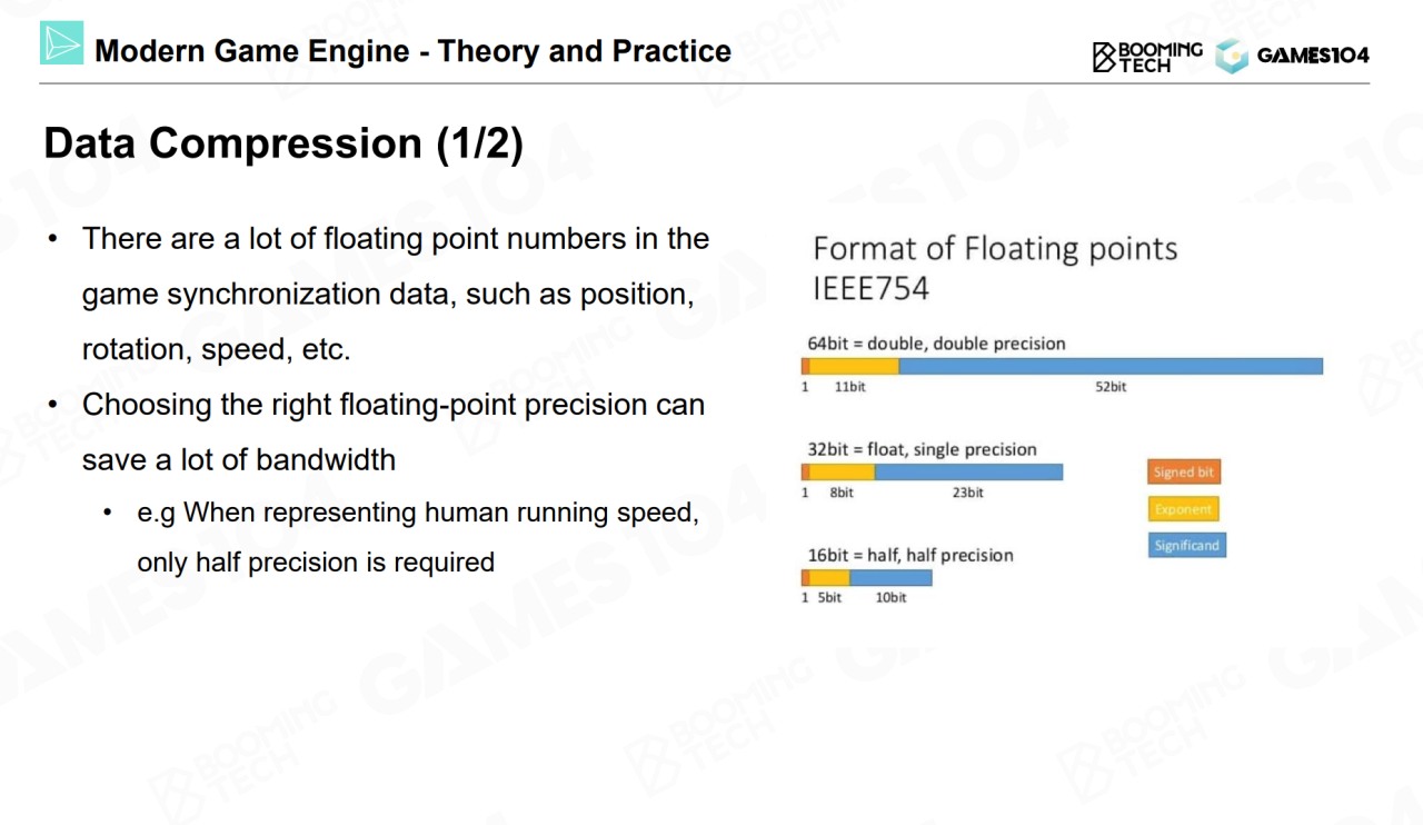 数据压缩(data compression)是经典的带宽优化方法。在网络游戏中我们可以把浮点数转换为低精度的定点数来减少数据量。