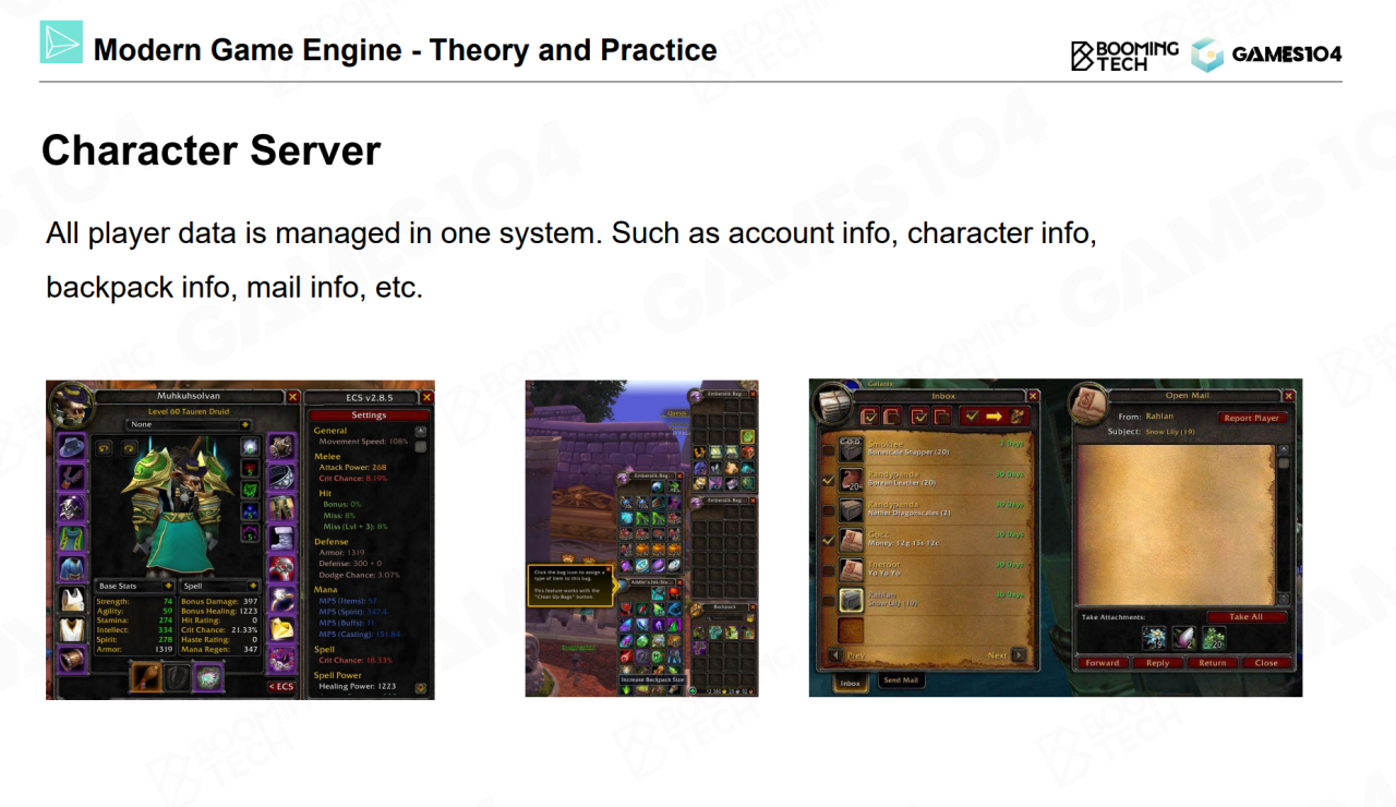 由于MMO中玩家的数据往往非常巨大,玩家的数据一般会保存在一个专门的服务器上称为character server。
