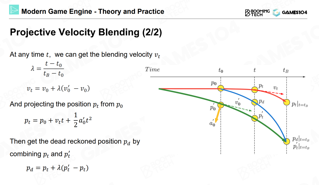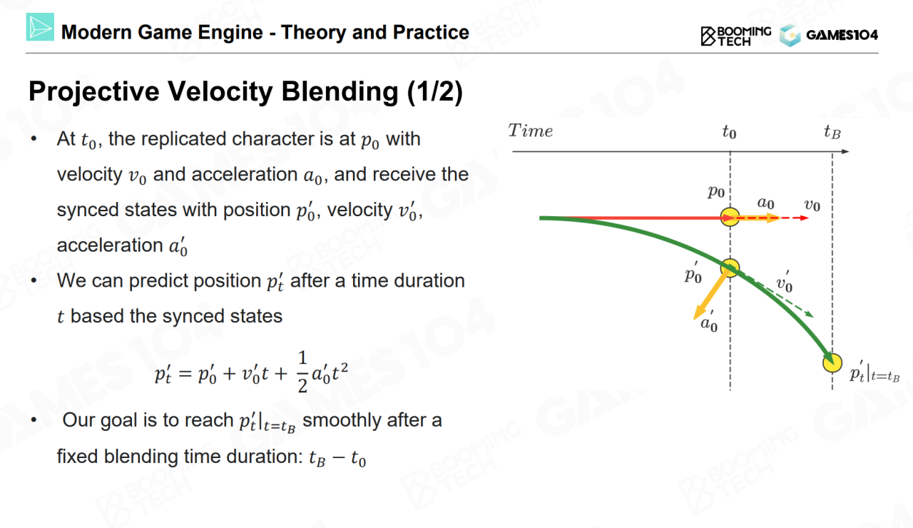 回到游戏领域的应用中来,projective velocity blending (PVB)是一种使用外插来更新角色位置的算法。假设$t_0$时刻角色的位置、速度和加速度分别为$p_0$、$v_0$和$a_0$,而收到来自服务器同步的位置、速度和加速度则是$p_0’$、$v_0’$和$a_0’$。假设$t_0$到$t_B$时间内没有意外状况发生,则$t$时刻角色的位置为: