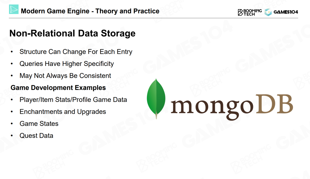除了关系数据库外,非关系数据库也是目前非常流行的数据存储方法。像游戏中的日志还有各种game state就比较适合使用非关系数据库。