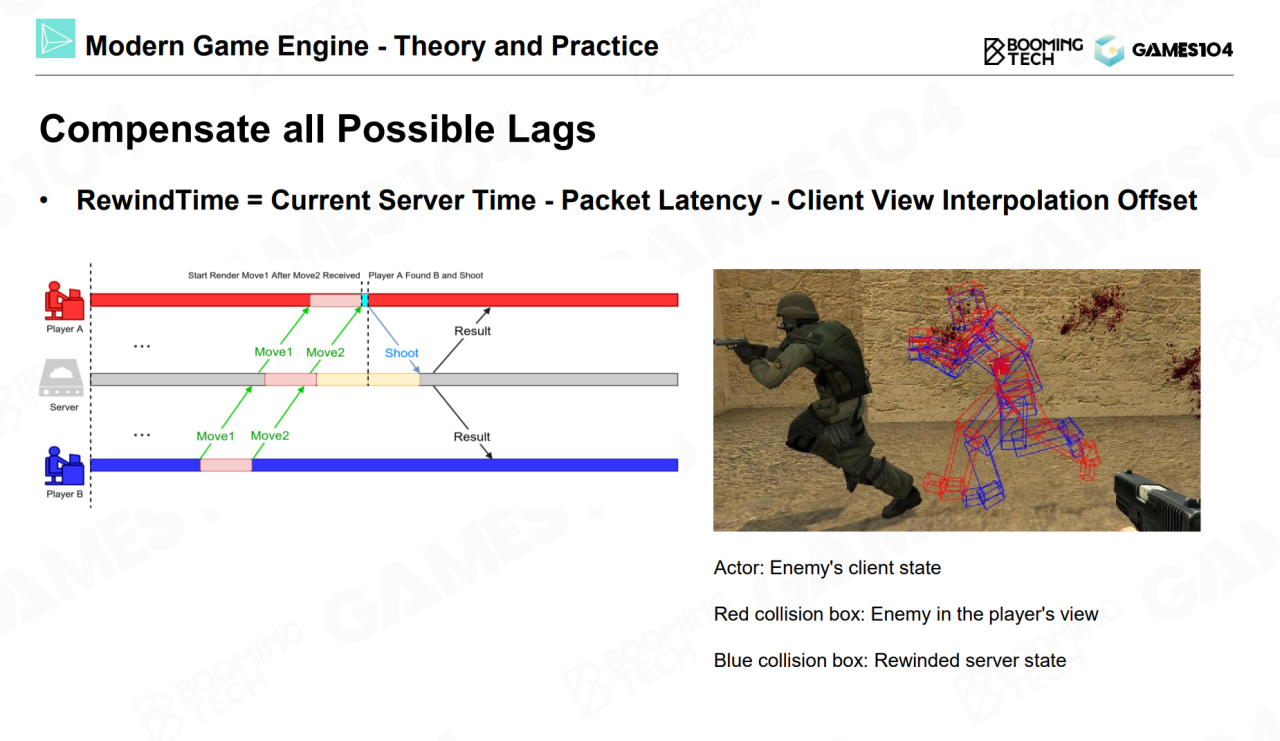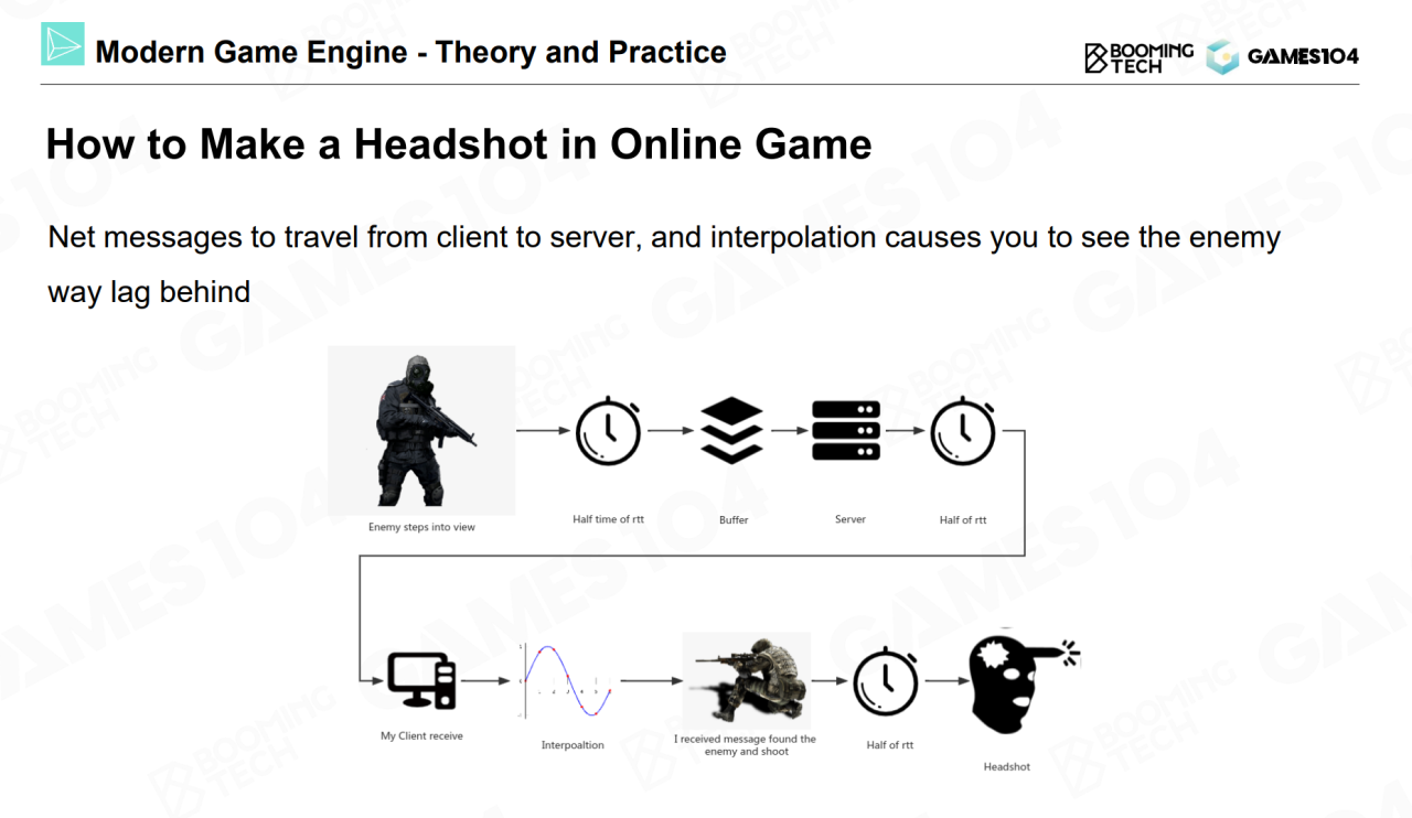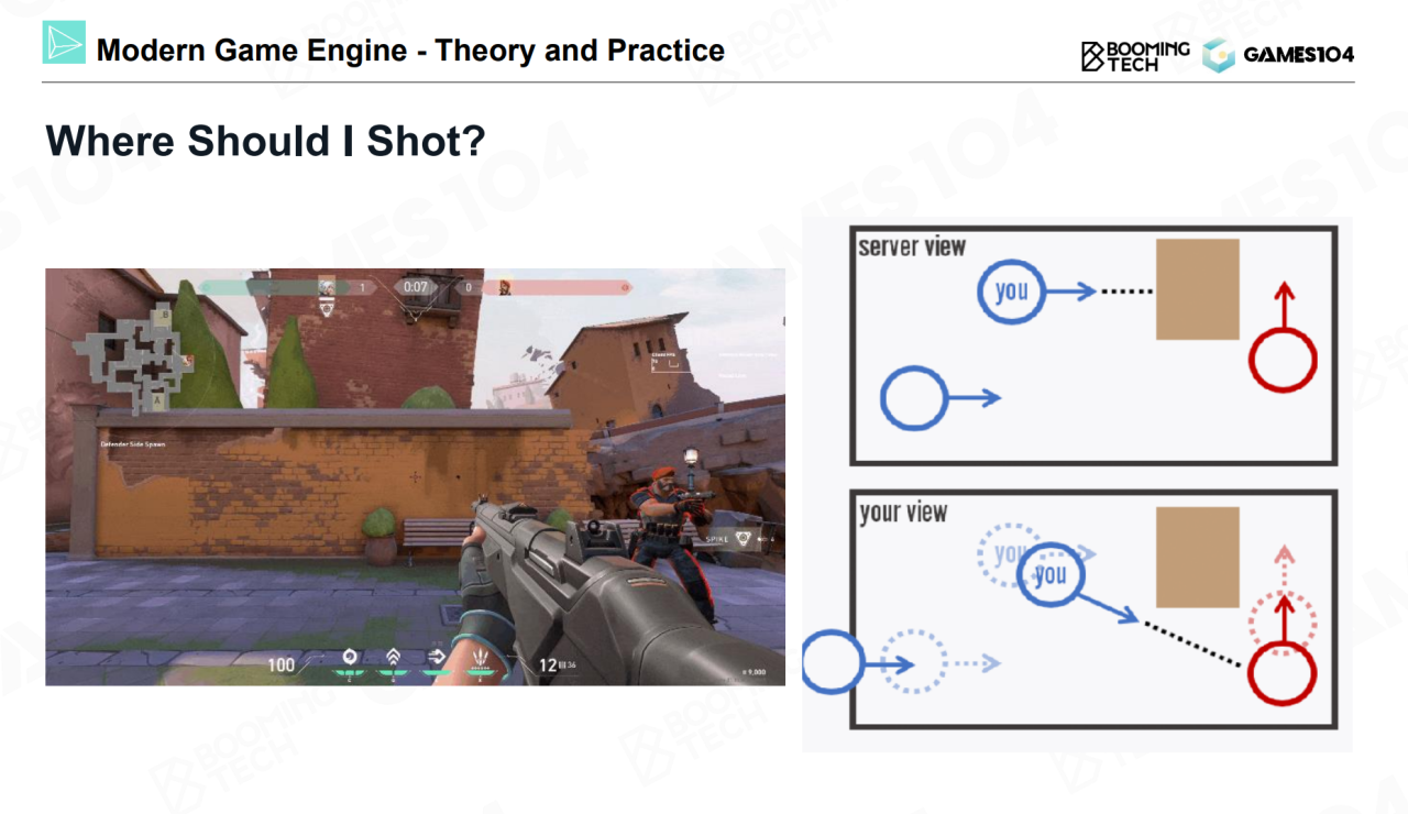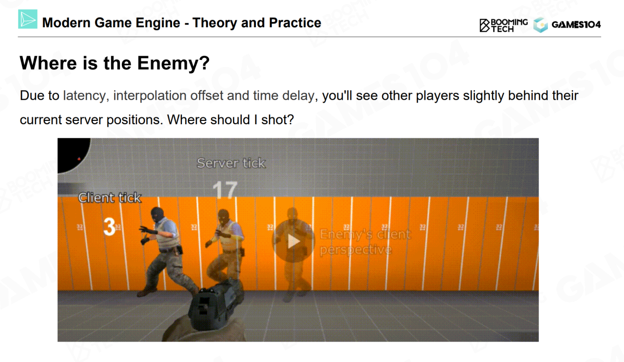 命中判定的难点之一在于确定敌人在什么位置。由于网络延迟和插值算法的存在,玩家视角下的目标是落后于服务器上目标的真实位置的。