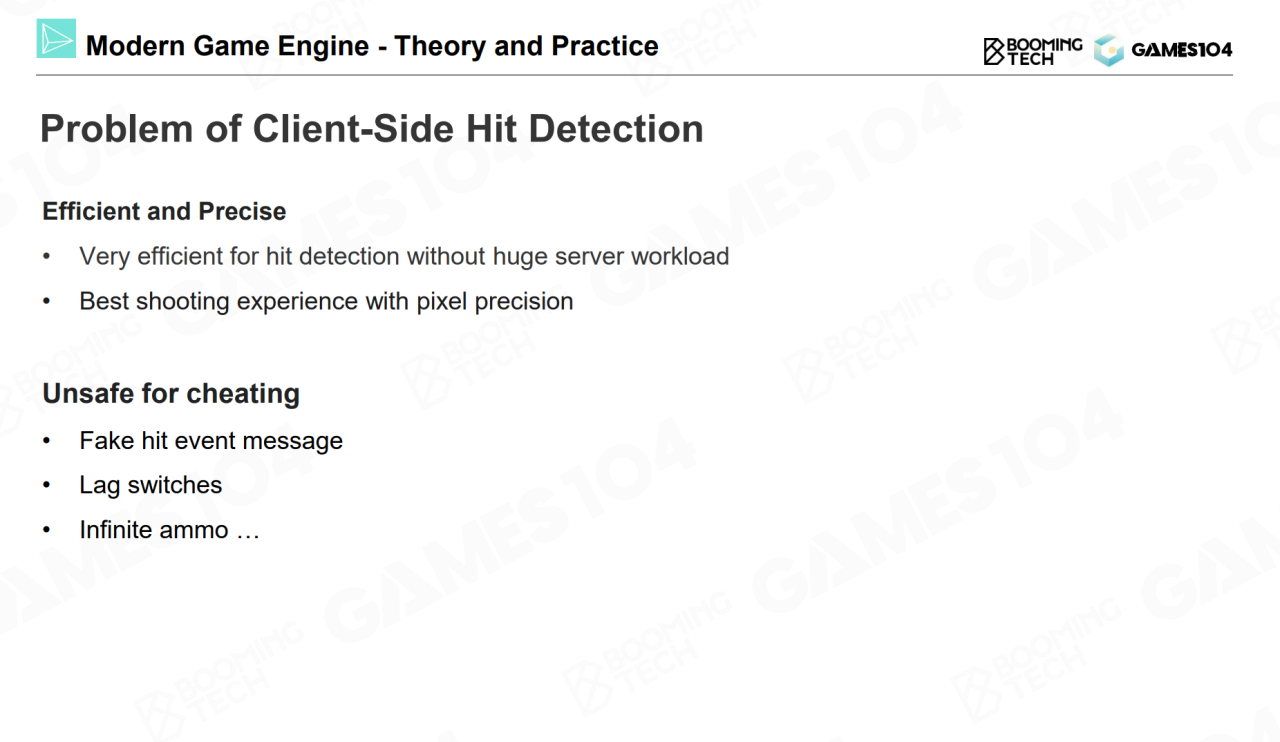在客户端上进行命中检测的优势在于它非常高效而且可以减轻服务器的负担,但它的核心问题在于它不够安全,一旦客户端被破解或是网络消息被劫持就需要非常复杂的反作弊系统来维持游戏平衡。