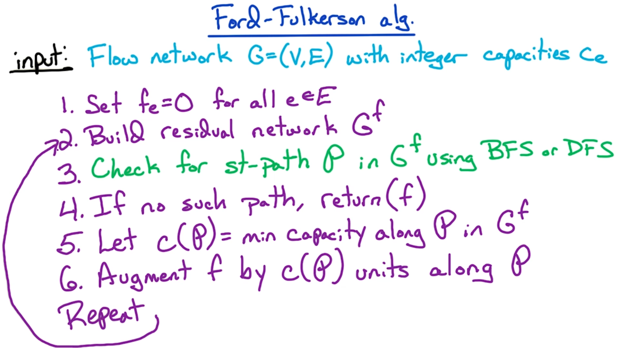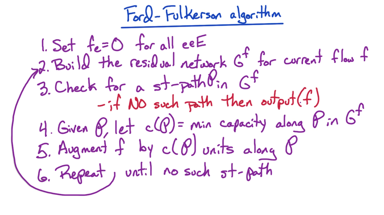 Ford-Fulkerson算法的核心步骤在于构造residual network,然后在residual network上寻找起点s到终点t的通路。利用这条通路更新residual network直到网络中不存在任何s到t的路径,此时网络就达到了最大流。
