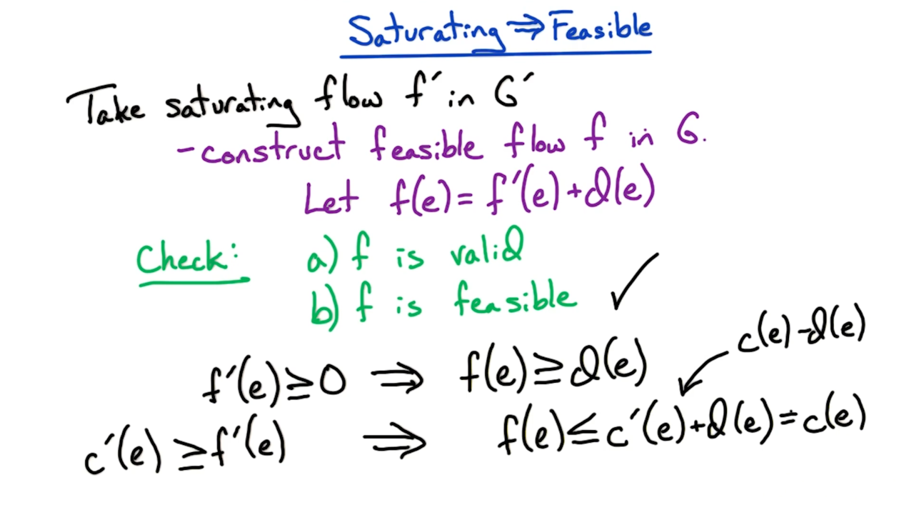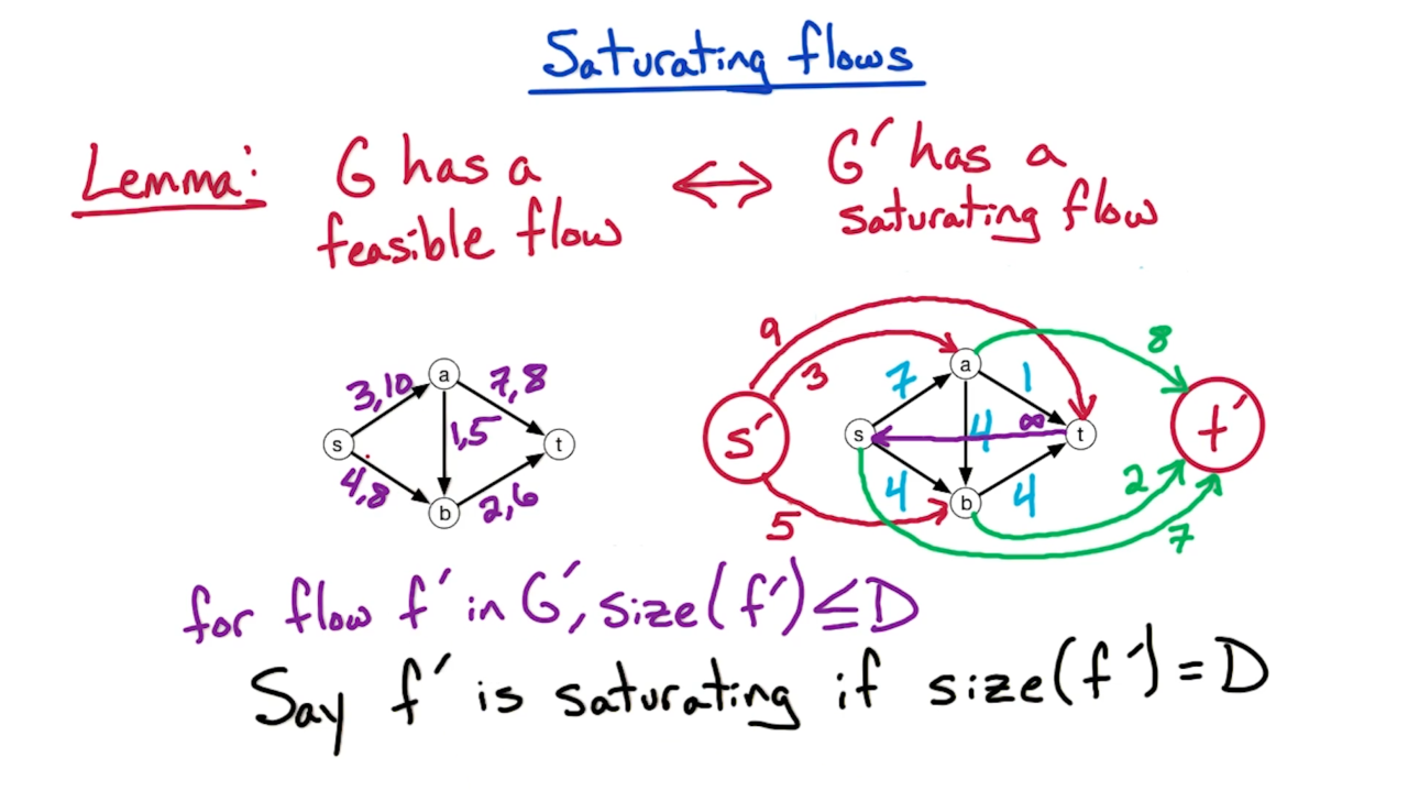 可以证明当G’上存在saturating flow时原始图G上具有feasible flow。