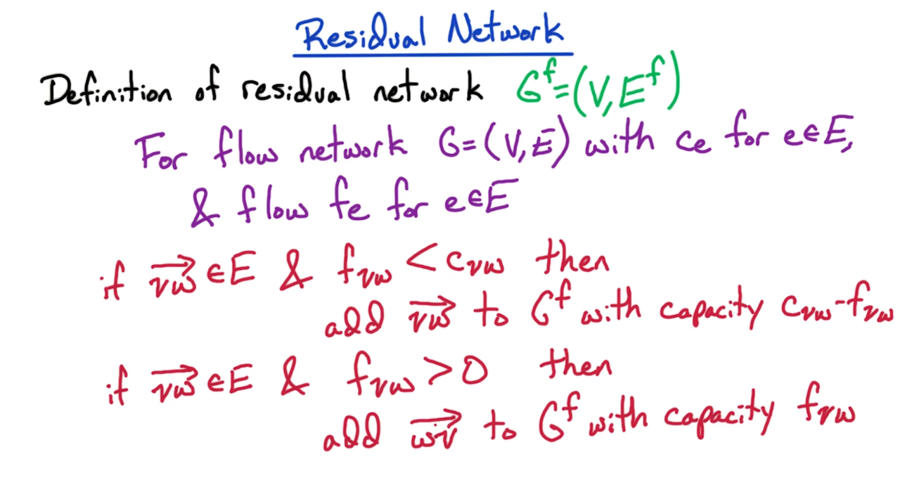 因此我们需要考虑反向的流量,即在原始流量的基础上构造residual network。在residual network中图的节点与原始图相同,而边的容量取决于原始图上边的流量。