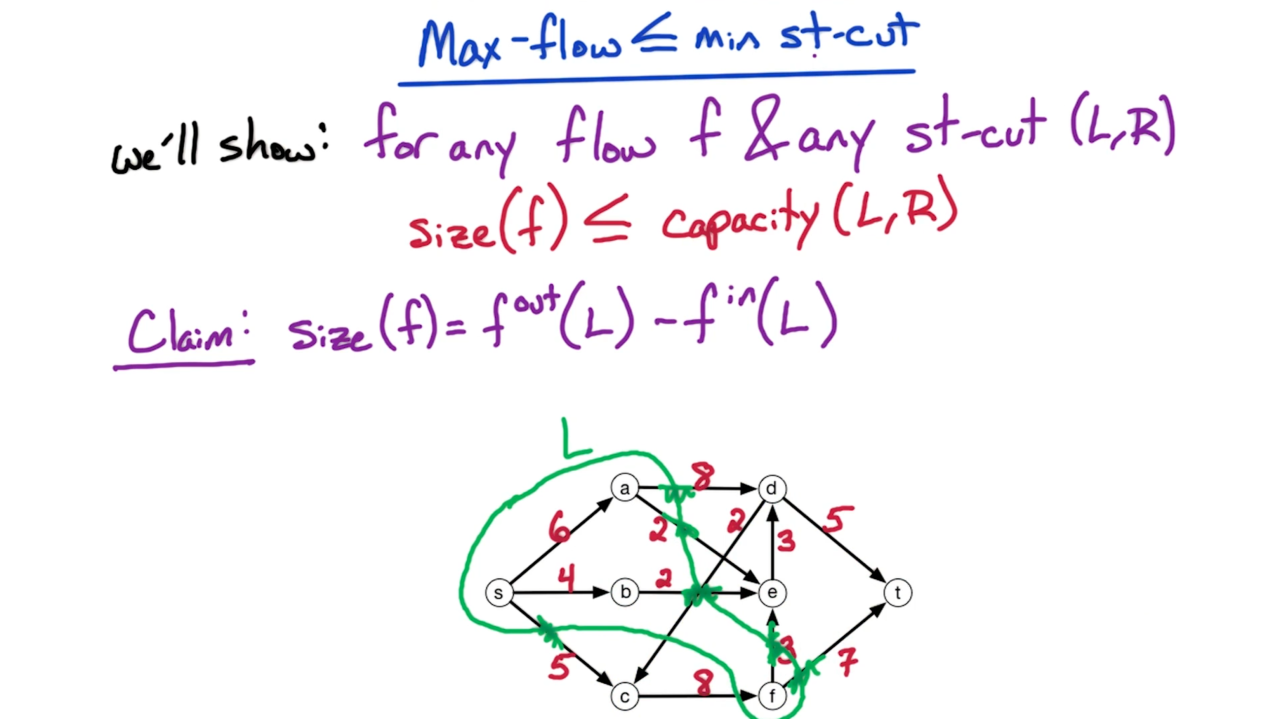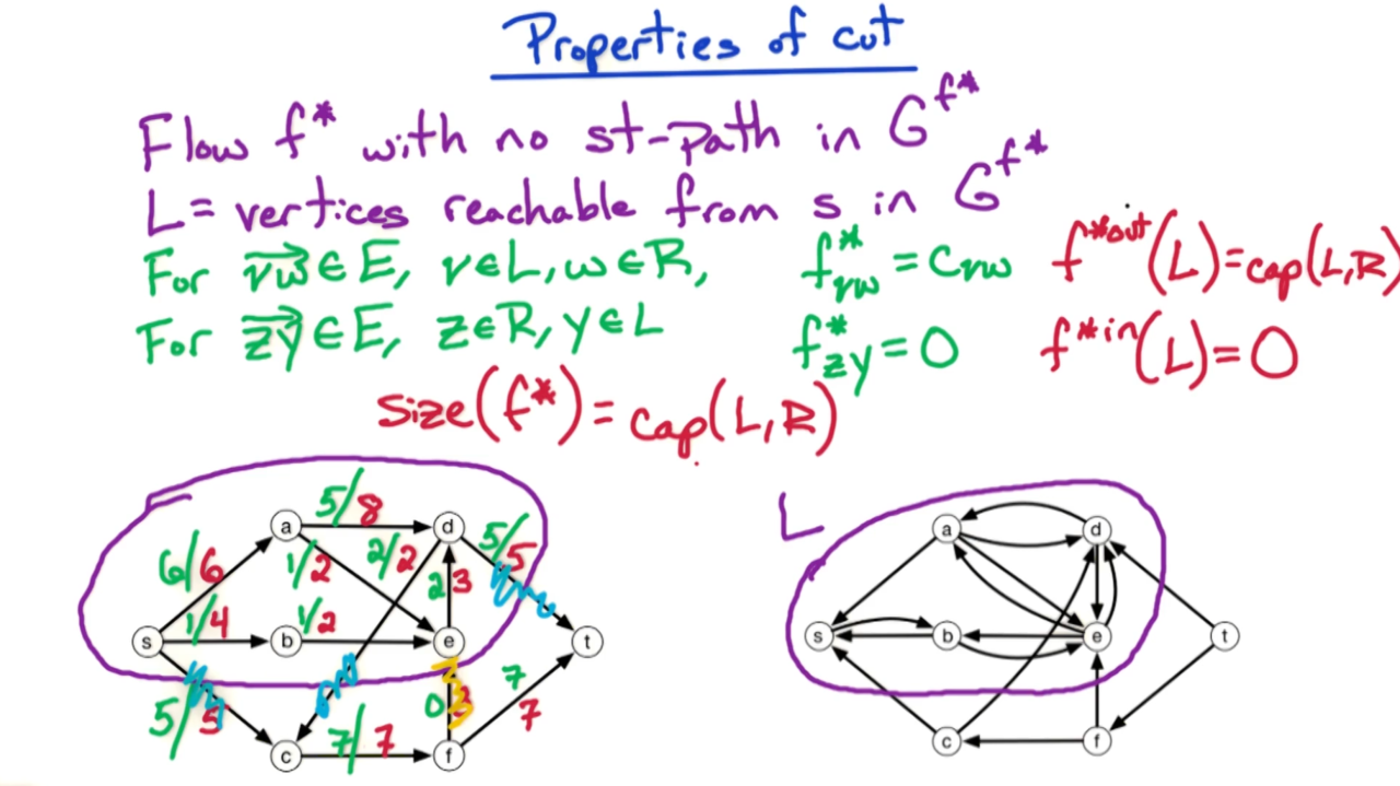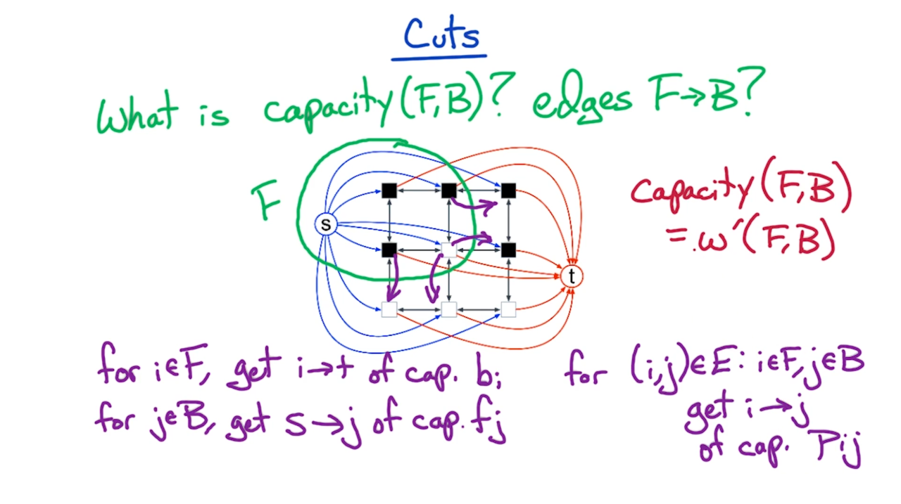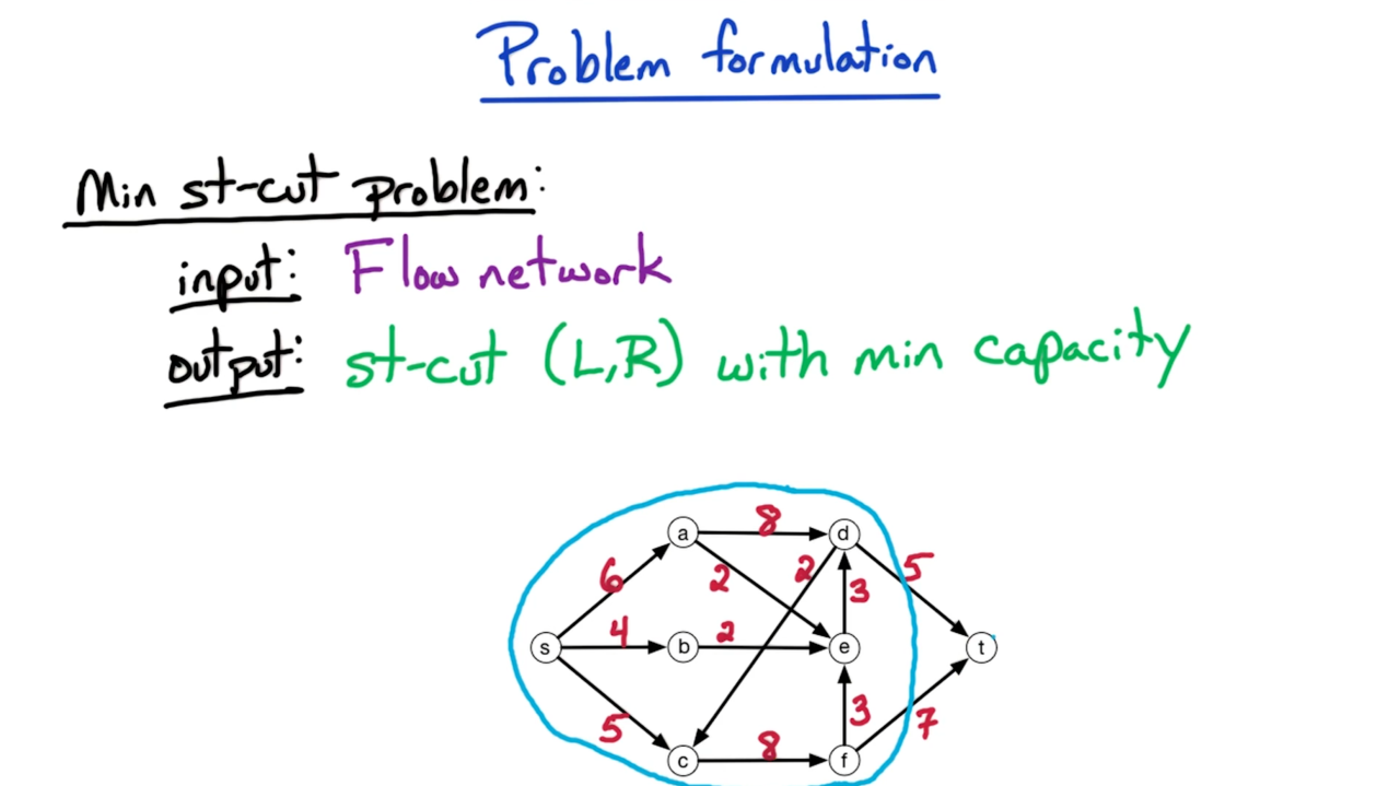 回忆图割的概念是把图划分为两部分L和R,连接它们的边称为cut。对于最大流问题我们可以把图根据源点s和终点t进行划分,此时的图割问题称为st-cut。完成划分后L和R的capacity定义为连接它们的所有从L到R的边权重之和。