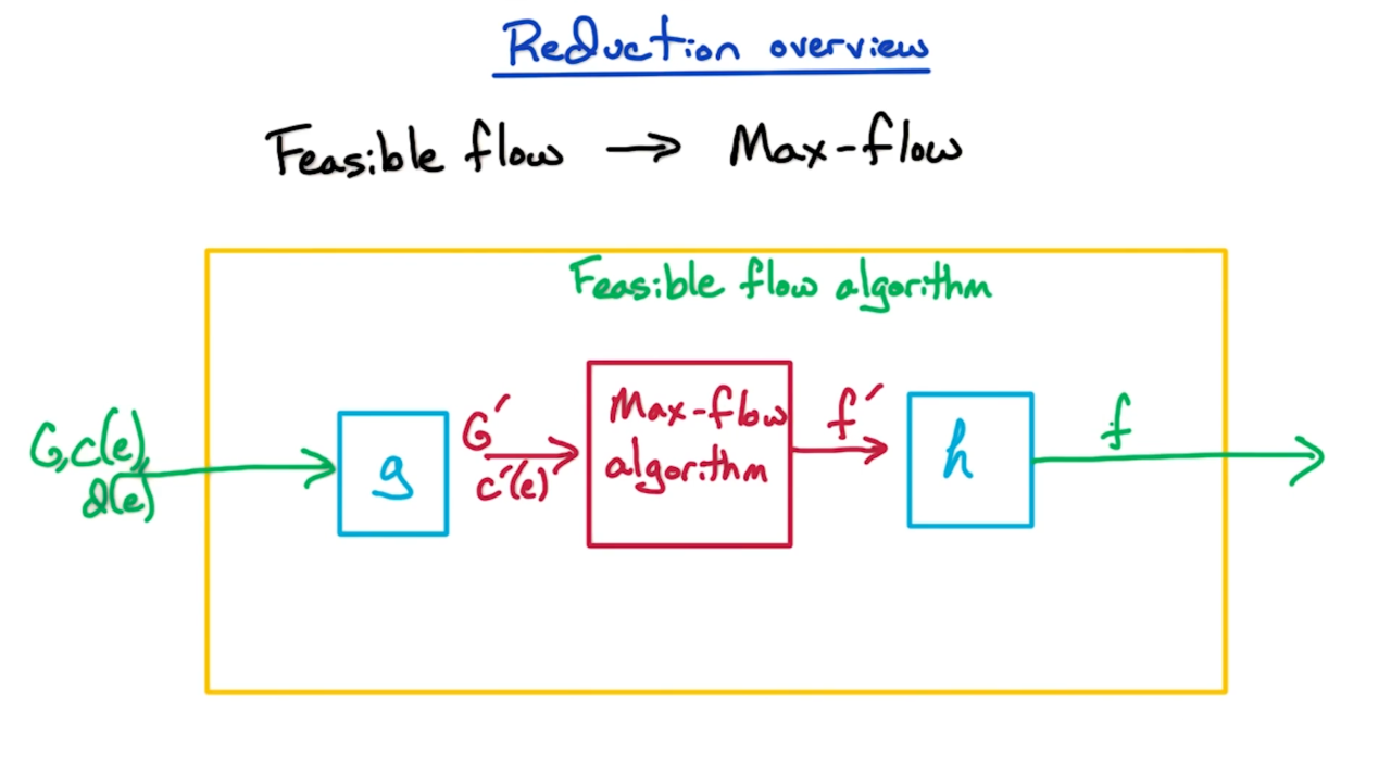 基于归约(reduction)的思想,我们可以把寻找feasible flow的问题转换为计算最大流,然后使用相关的算法进行求解。具体来说,我们首先把包含capacity和demand的图G转换为一个只包含capacity的图G’,然后在G’上求解最大流问题,最后把G’上的最大流f’转换为原始图G上的feasible flow。因此寻找feasible flow的核心在于设计G和G’之间的转换函数g和h。