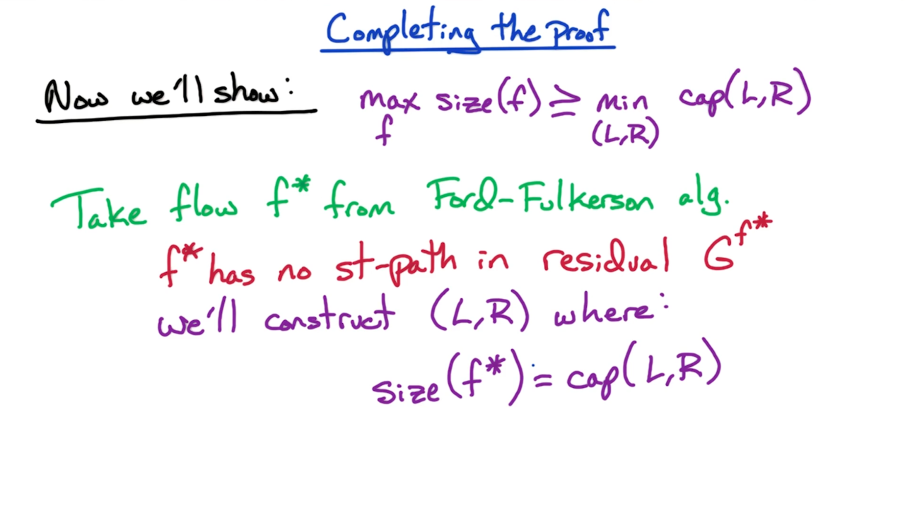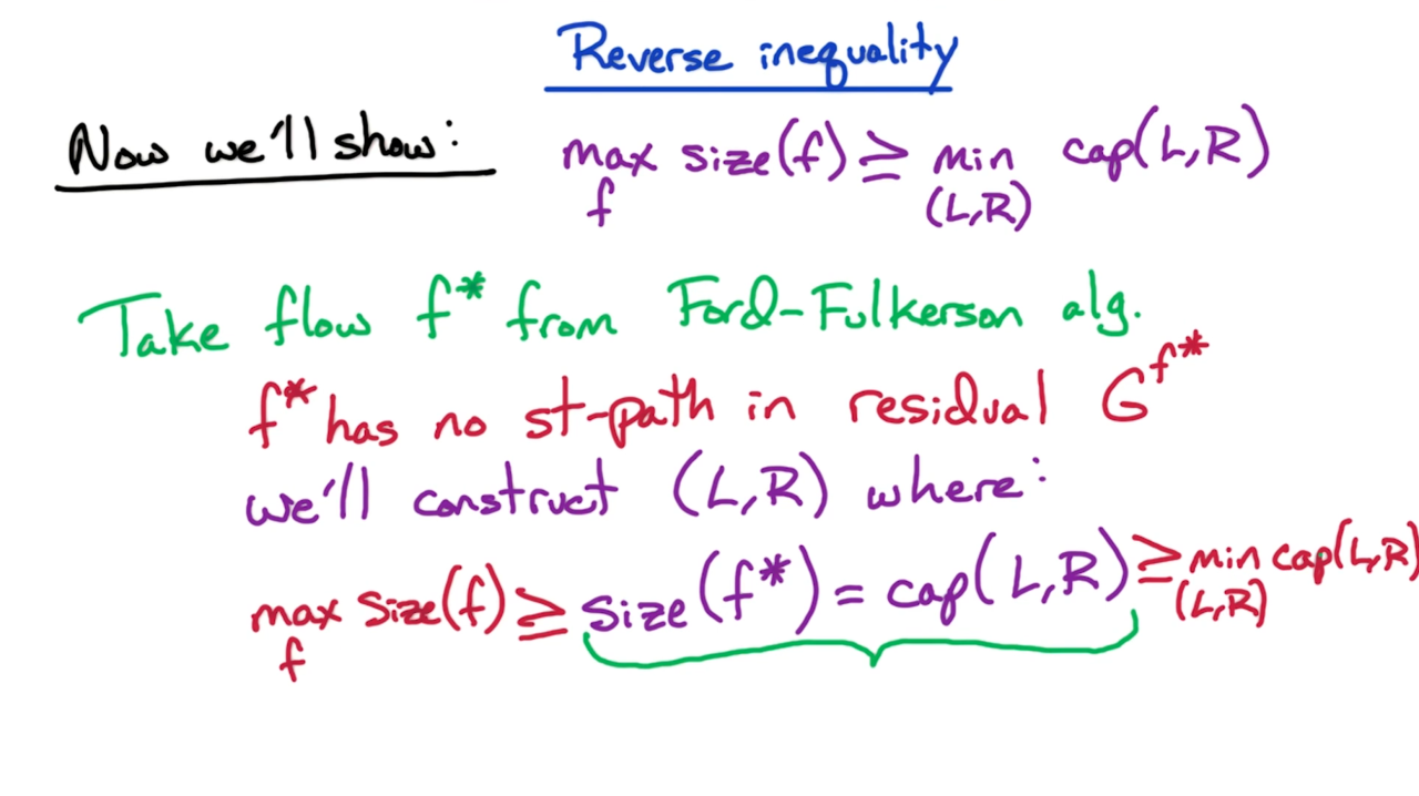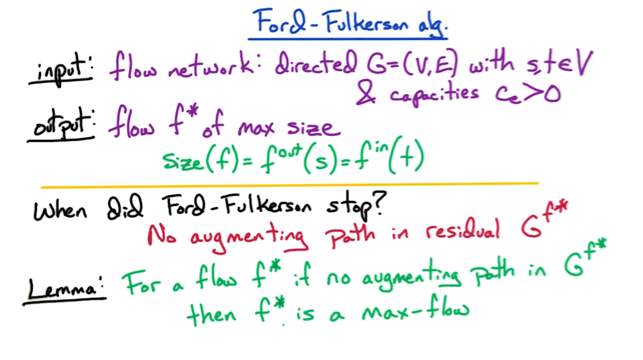 在介绍最大流与最小割问题的关系前我们先回顾一下Ford-Fulkerson算法。实际上Ford-Fulkerson算法的正确性依赖于如下定理:当residual network上没有可行的路径时说明已经实现了最大流。