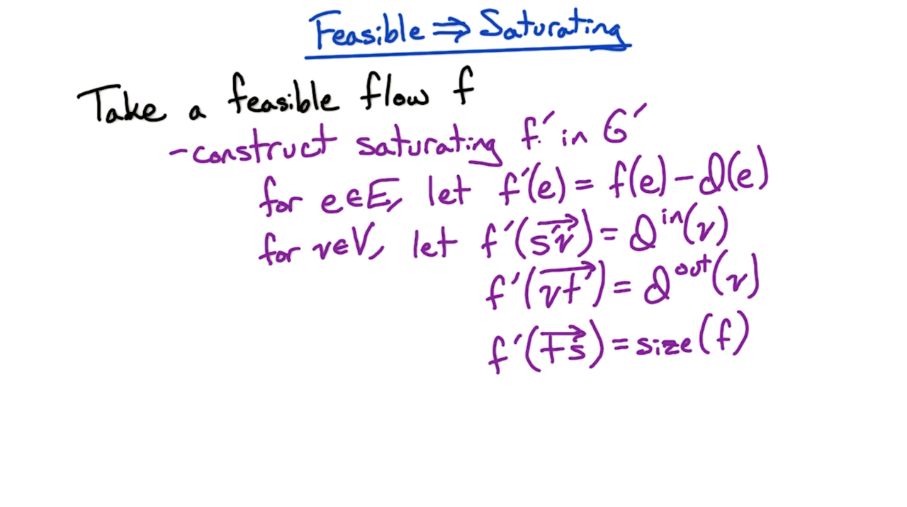 当我们得到了一个feasible flow时,同样可以在G’上构造一个saturating flow。