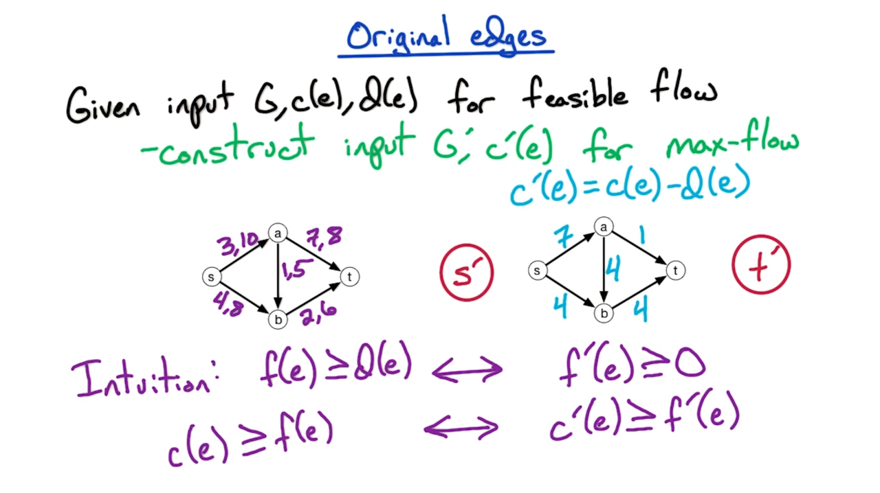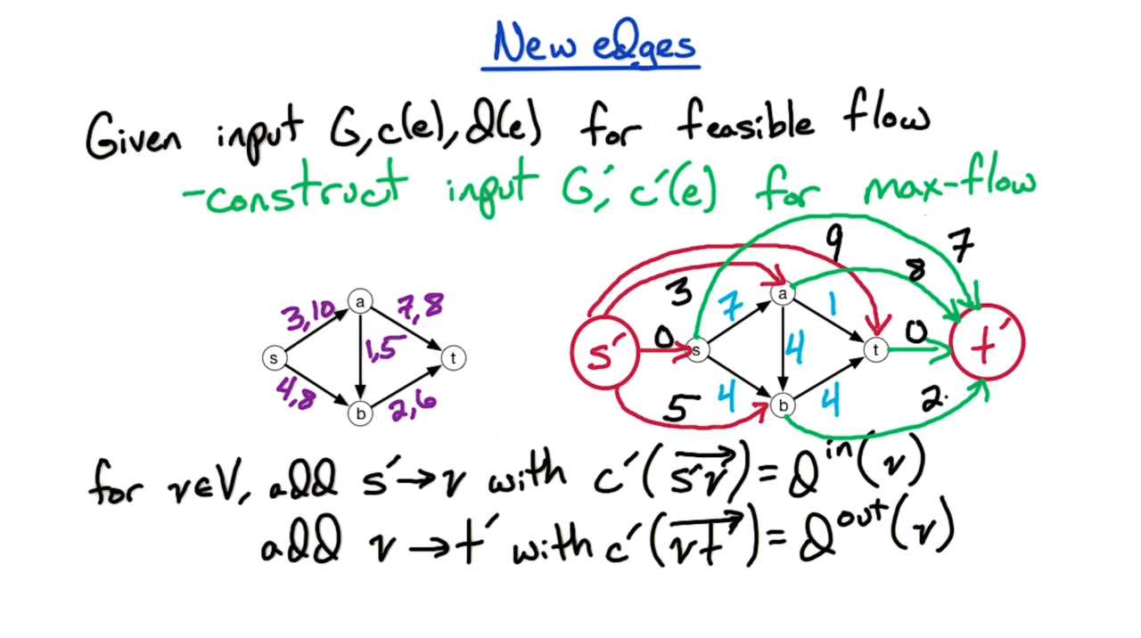 首先来考虑G到G’的转换函数g。我们需要把原始边上的capacity减去demand,同时在原始的图上添加新的源点s’和终点t’以及新的边。