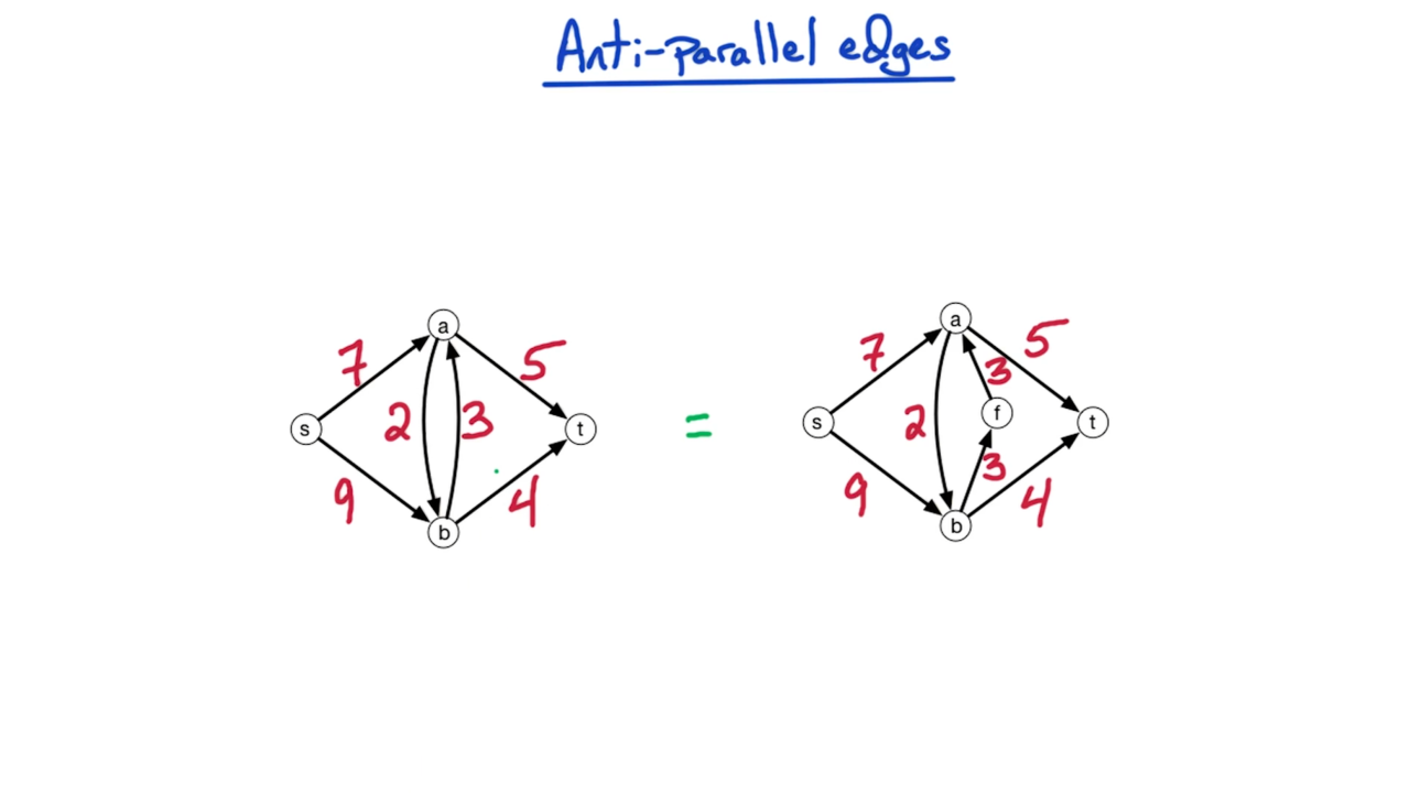 不过在最大流问题中我们不允许节点之间存在平行的边,即相互指向的边。如果出现这种情况则可以通过在这一对边上添加一个新节点的方式进行处理。