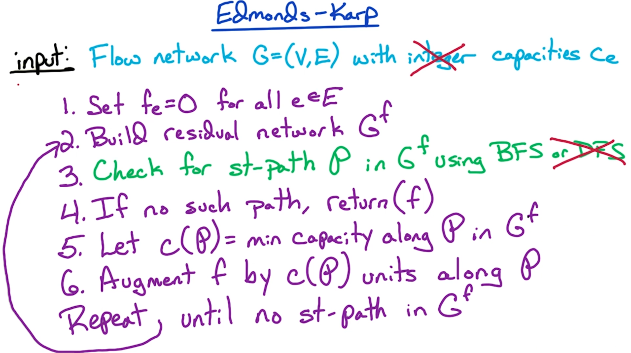 Edmonds-Karp算法与Ford-Fulkerson算法非常类似,其主要区别在于寻找s到t的路径时必须要使用广度优先搜索(breadth first search, BSF)。