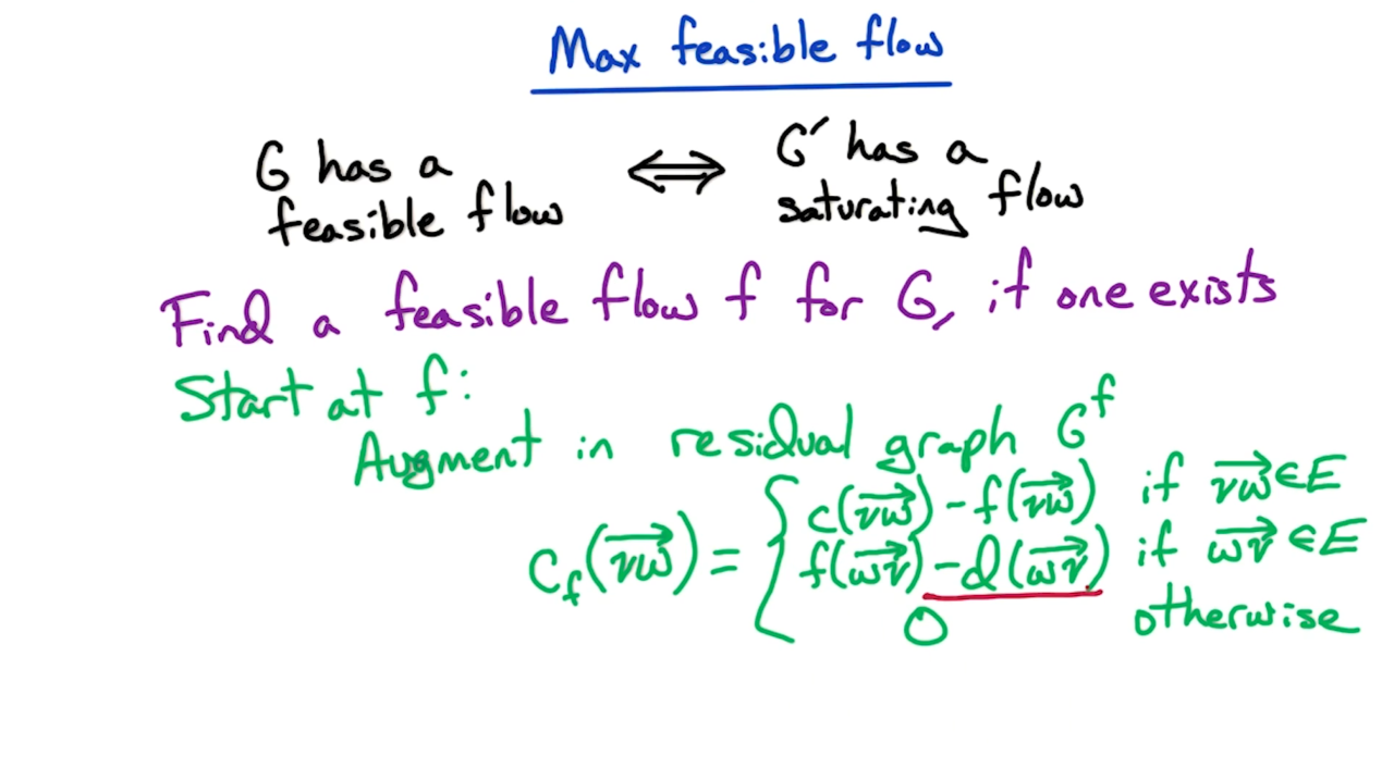 因此原始图G存在feasible flow等价于G’具有saturating flow,因此我们只需要在G’上通过最大流算法寻找saturating flow即可。得到了一个feasible flow之后可以通过在residual network上添加augment path的方式来进行最大化,不过需要注意的是此时构造residual network的方式与Ford-Fulkerson算法有所不同。
