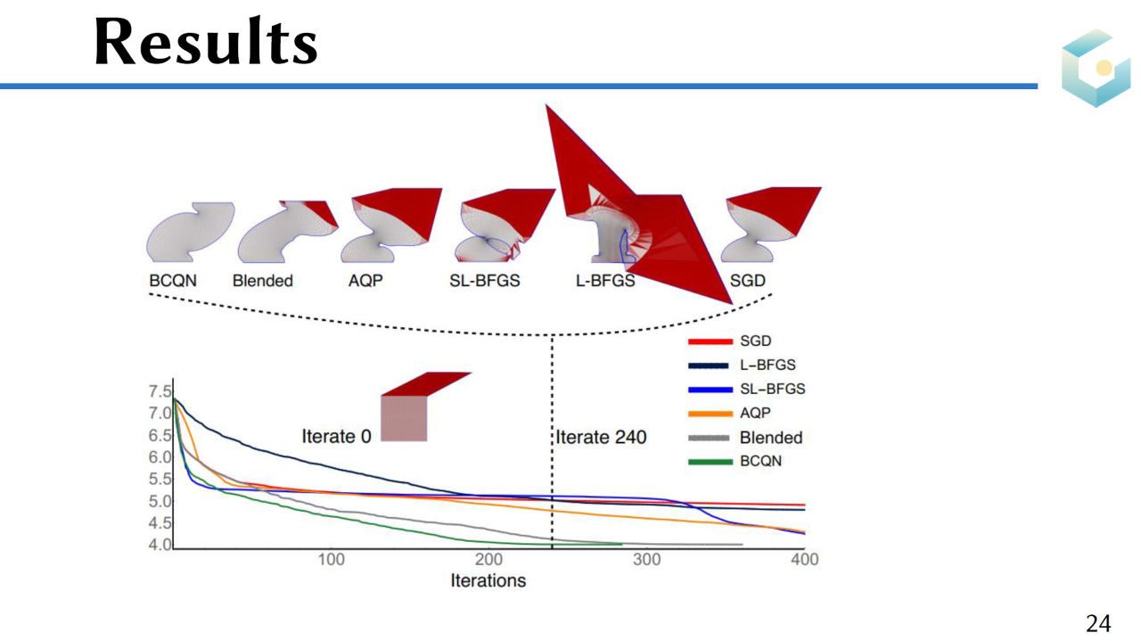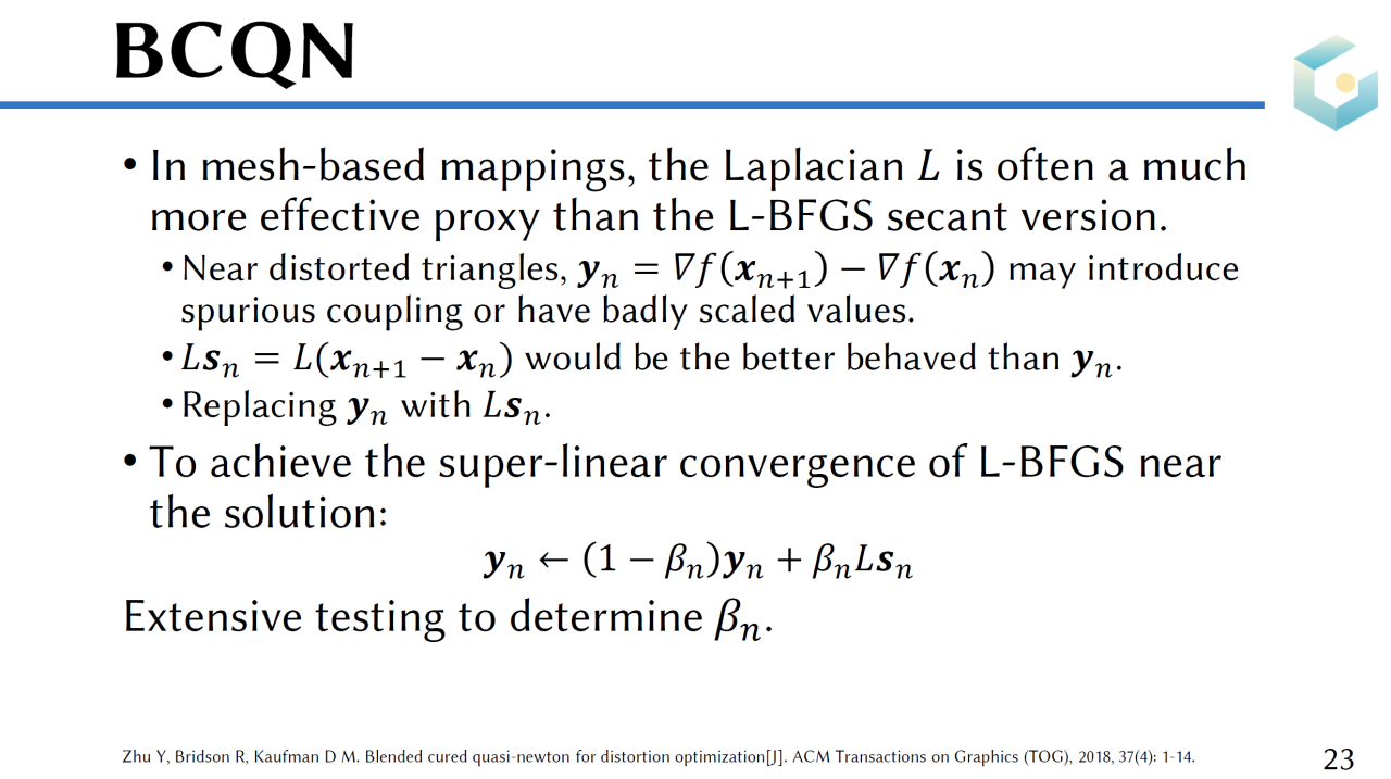 BCQN是对L-BFGS的改进。当几何扭曲比较大时标准L-BFGS容易产生数值不稳定的问题,因此BCQN指出可以使用网格的Laplace矩阵\(\mathbf{L}\)来计算\(\mathbf{y}_n\):