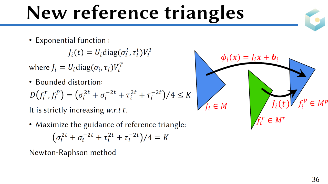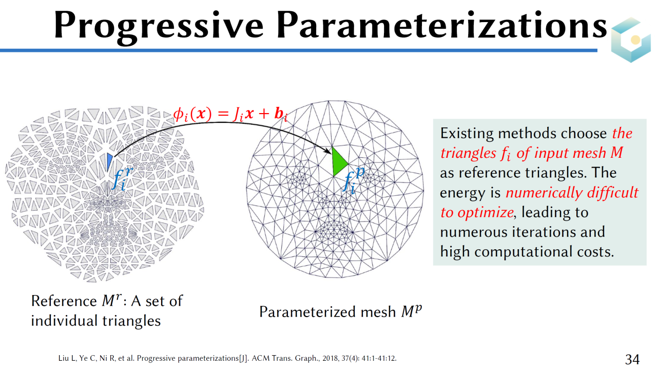 因此渐进参数化(progressive parameterization, PP)的思想在于重新计算一个新的参考三角形,使得它与参数化之间的扭曲是有界的。然后再令构造的临时参考三角形逐步逼近原始网格,通过不断地优化和迭代就可以让最终的参数化结果逼近原始网格。由于每一步的优化都是在一个低扭曲的三角形上,整个参数化过程会比直接进行优化快很多。