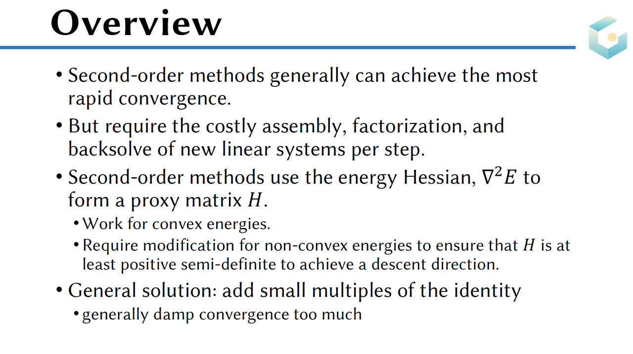 \[\tilde{E}(\mathbf{x}) = E(\mathbf{x}_i) + (\mathbf{x} - \mathbf{x}_i)^T \nabla E + \frac{1}{2} (\mathbf{x} - \mathbf{x}_i)^T H_i (\mathbf{x} - \mathbf{x}_i)\]这样近似后的目标函数就是一个凸函数,可以使用各种通用求解器来进行求解。需要注意的是二次项\(H_i\)不一定严格等于目标函数的Hessian矩阵,各种算法在实现时会使用不同的技巧来估计真实的Hessian矩阵。