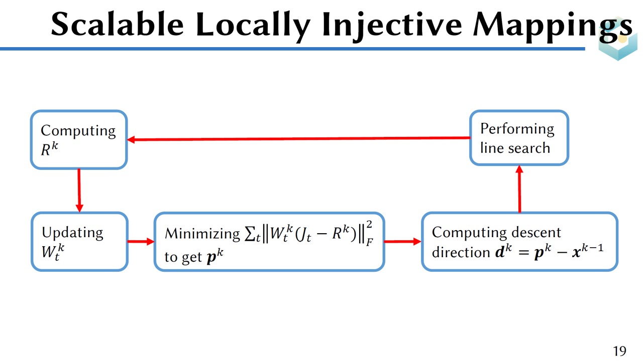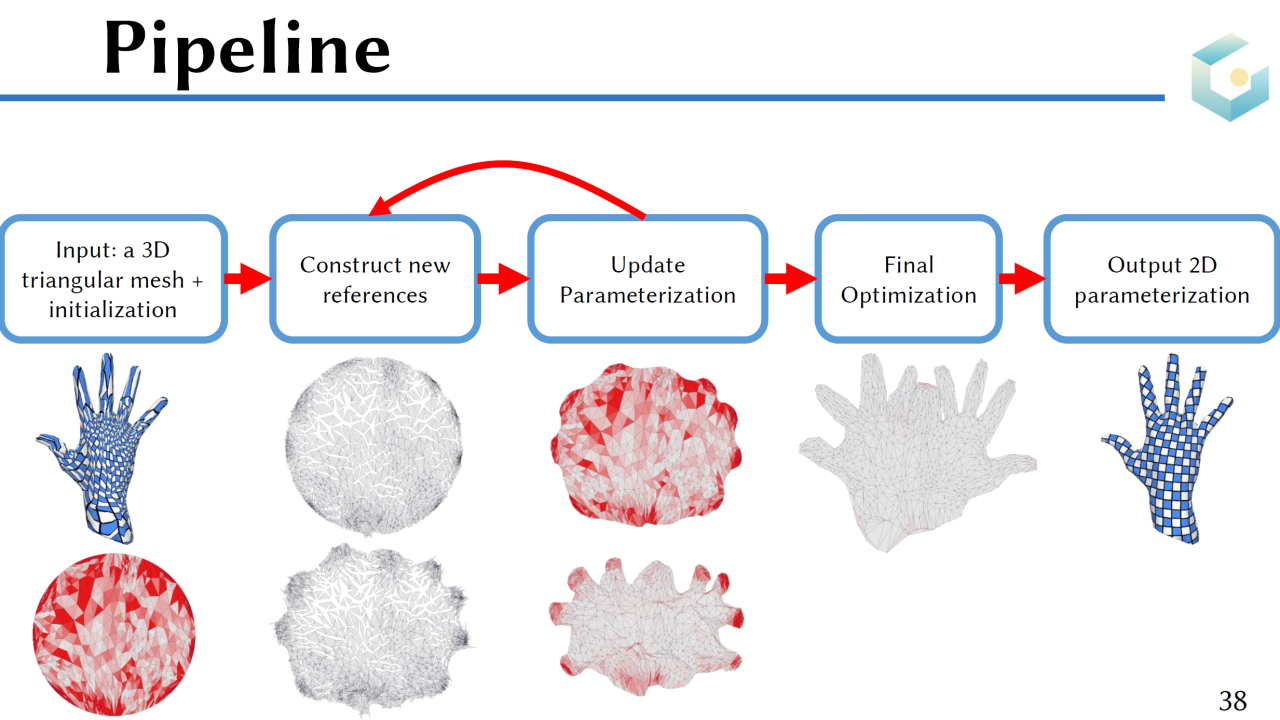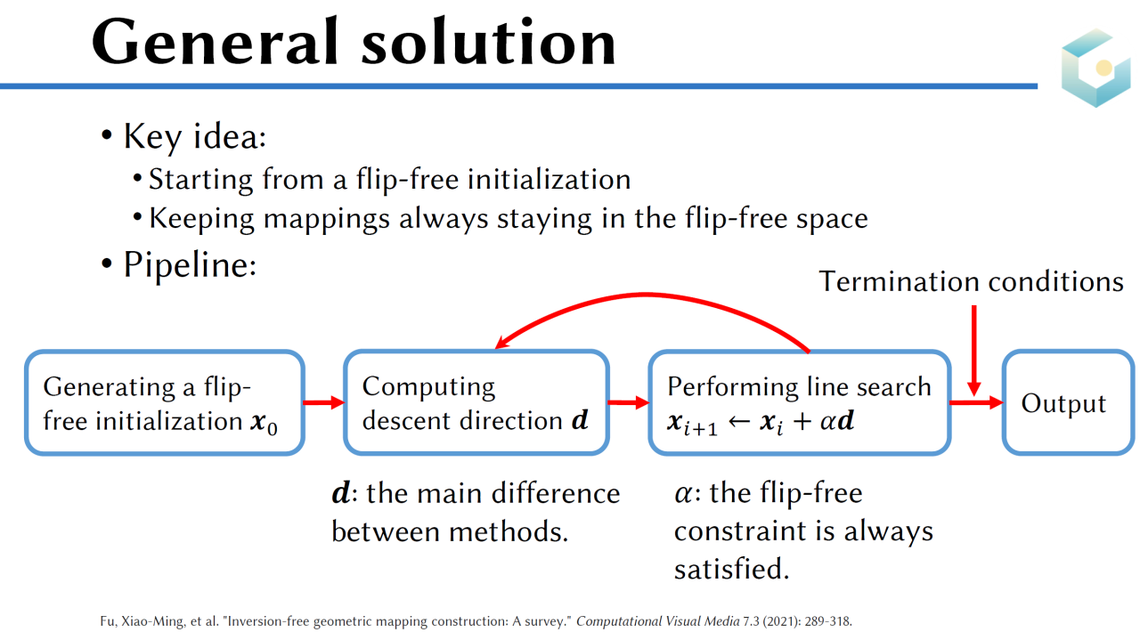 这类方法一般会以Tutte’s embedding作为初始化,然后在无翻转映射的空间中通过迭代的方式来求解几何扭曲的最小化问题。整个求解流程可以抽象为下图: