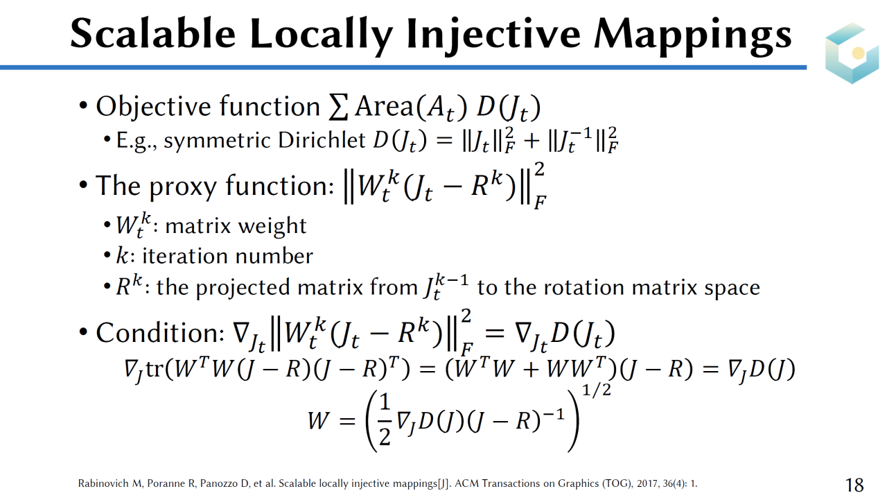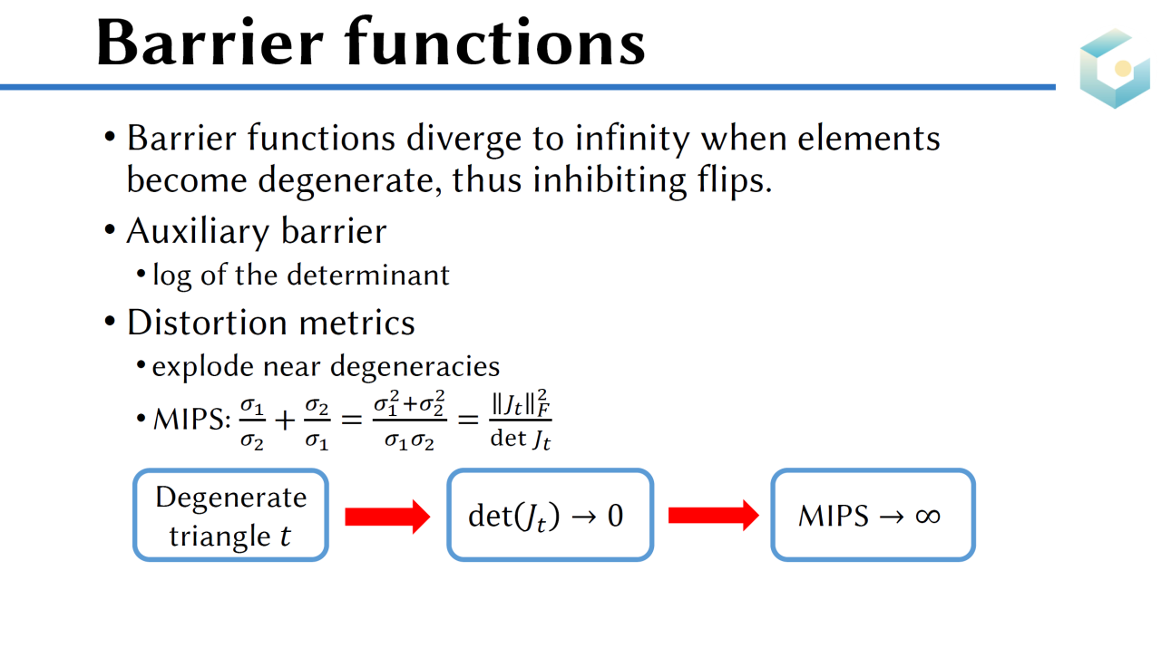 为了保证优化过程中不会出现翻转的现象,在整个目标函数中还会加入一个障碍函数(barrier function)。当三角形趋向于退化或是翻转时,障碍函数会快速达到无穷大从而避免这种情况。除了单独设置障碍函数外还可以使用几何扭曲的度量函数来实现类似的功能,比如说MIPS函数就可以避免退化的情况: