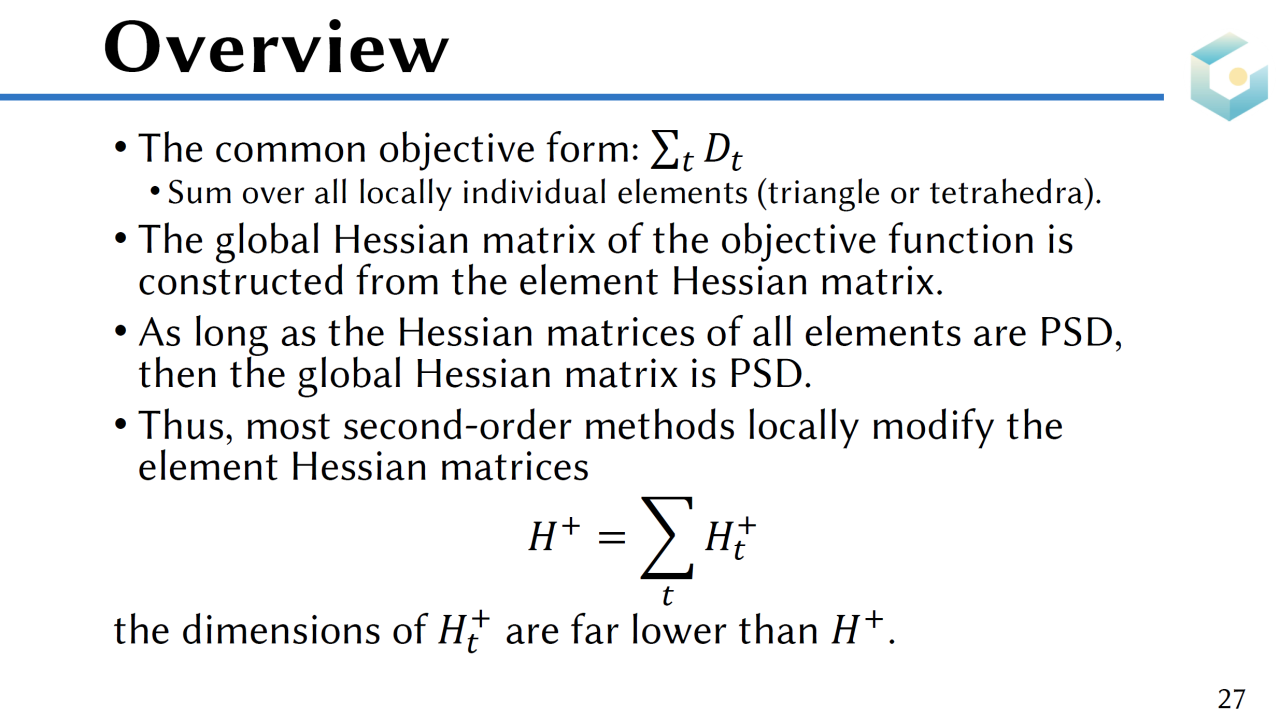 由于大多数Hessian矩阵都可以表示为每个三角形上Hessian矩阵的和,因此只要保证每个三角形上Hessian矩阵的正定性即可。