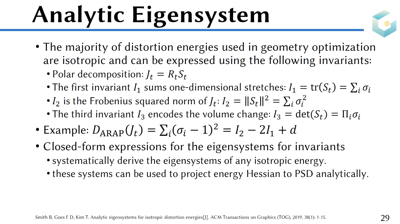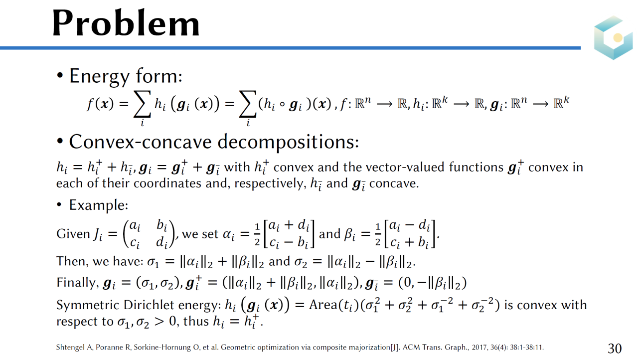 我们可以把能量函数\(f\)分解为\(h\)和\(g\)两个函数的复合,其中\(g\)将顶点坐标映射到某个空间然后在这个空间上通过\(h\)计算得到实际的能量。比如说我们可以取\(g\)为计算Jacobian矩阵特征值的过程,此时\(h\)即为利用特征值来构造所需的能量项。