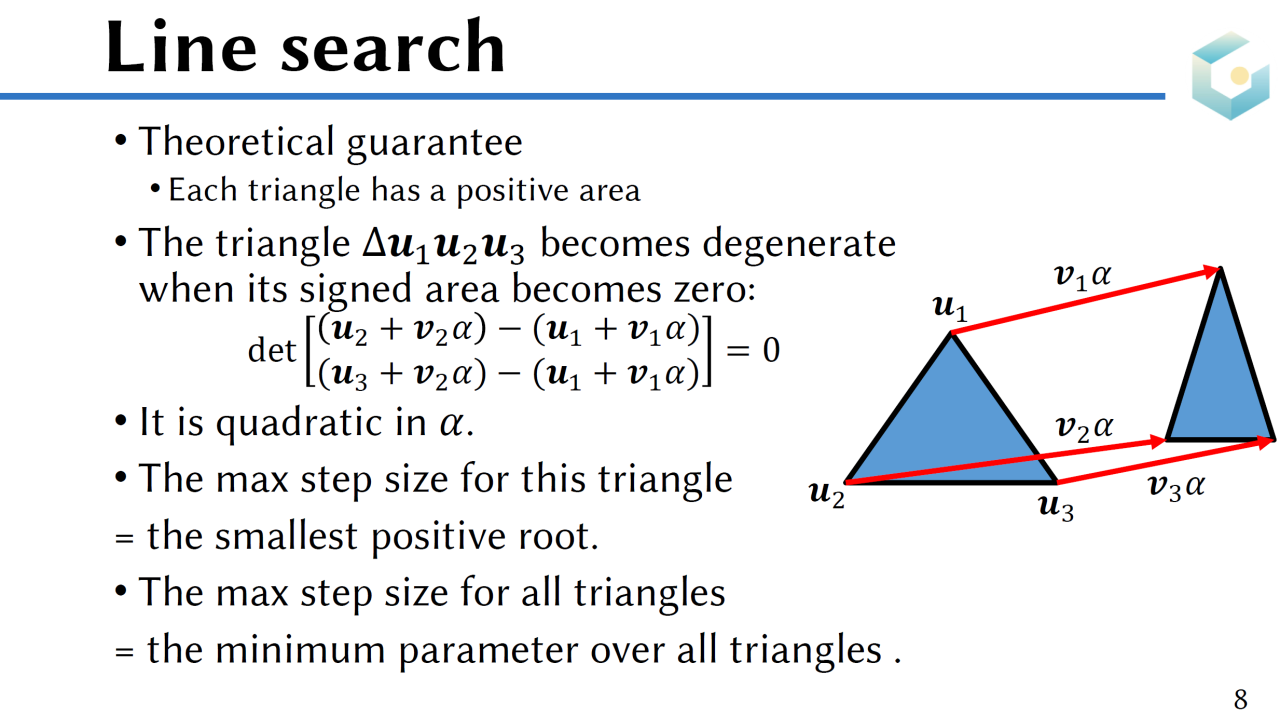 \[\det \begin{bmatrix} (\mathbf{u}_2 + \mathbf{v}_2 \alpha) - (\mathbf{u}_1 + \mathbf{v}_1\alpha) \\ (\mathbf{u}_3 + \mathbf{v}_3 \alpha) - (\mathbf{u}_1 + \mathbf{v}_1\alpha) \\ \end{bmatrix} = 0\]对行列式进行展开可以得到关于\(\alpha\)的二次多项式,其最小正数根即为迭代时的最大步长。因此在整个网格上最大优化步长即为所有三角形上二次多项式的最小正根。当然在进行优化时还要保证步长满足Wolfe condition。