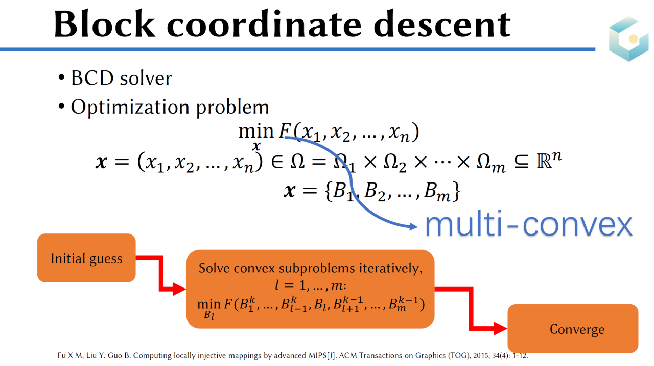 一阶方法只利用了目标函数的一阶导数,相当于把二阶项\(H_i\)直接取0。其中分块坐标下降法(block coordinate descent, BCD)通过对优化变量进行分块的方式每一次迭代只更新一部分变量,而对于参数化的问题则可以把网格上每一个顶点作为一个block,每次只更新一个顶点坐标。