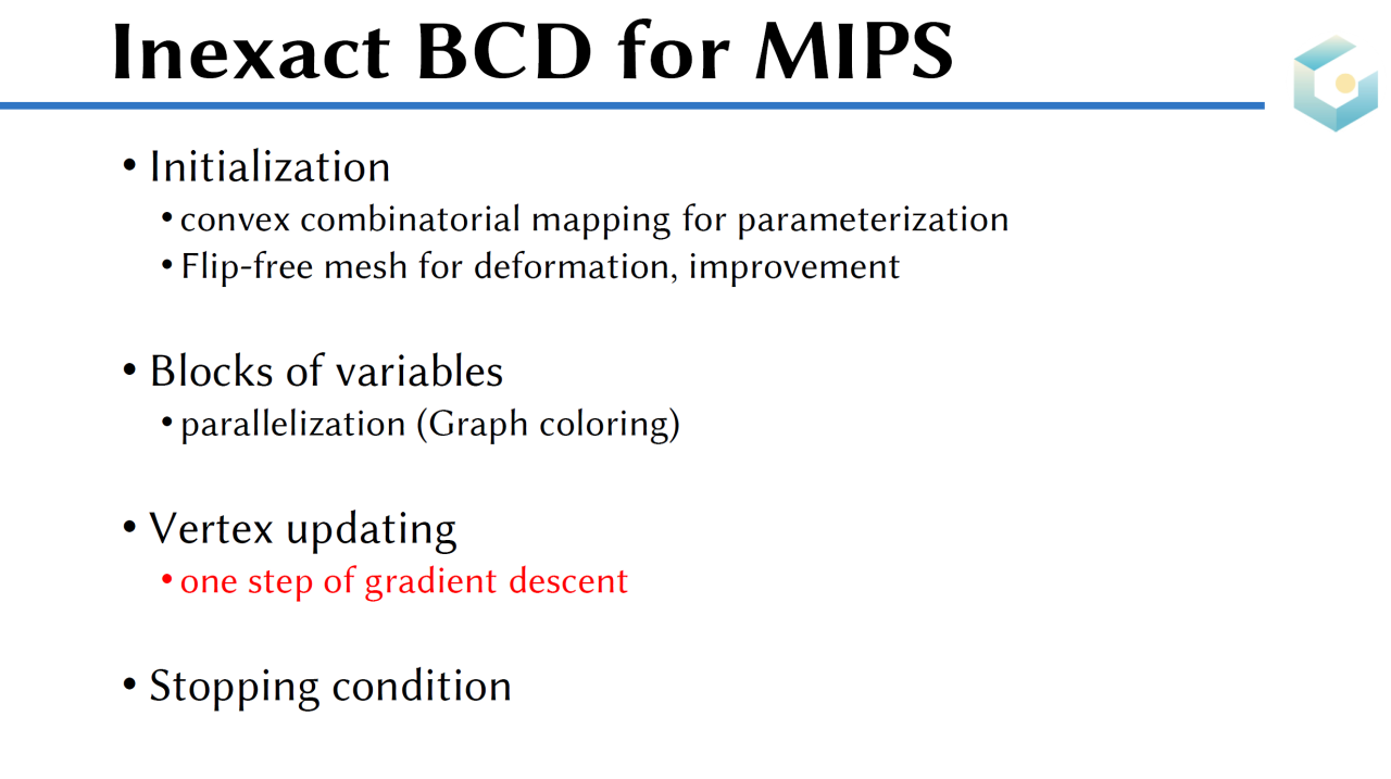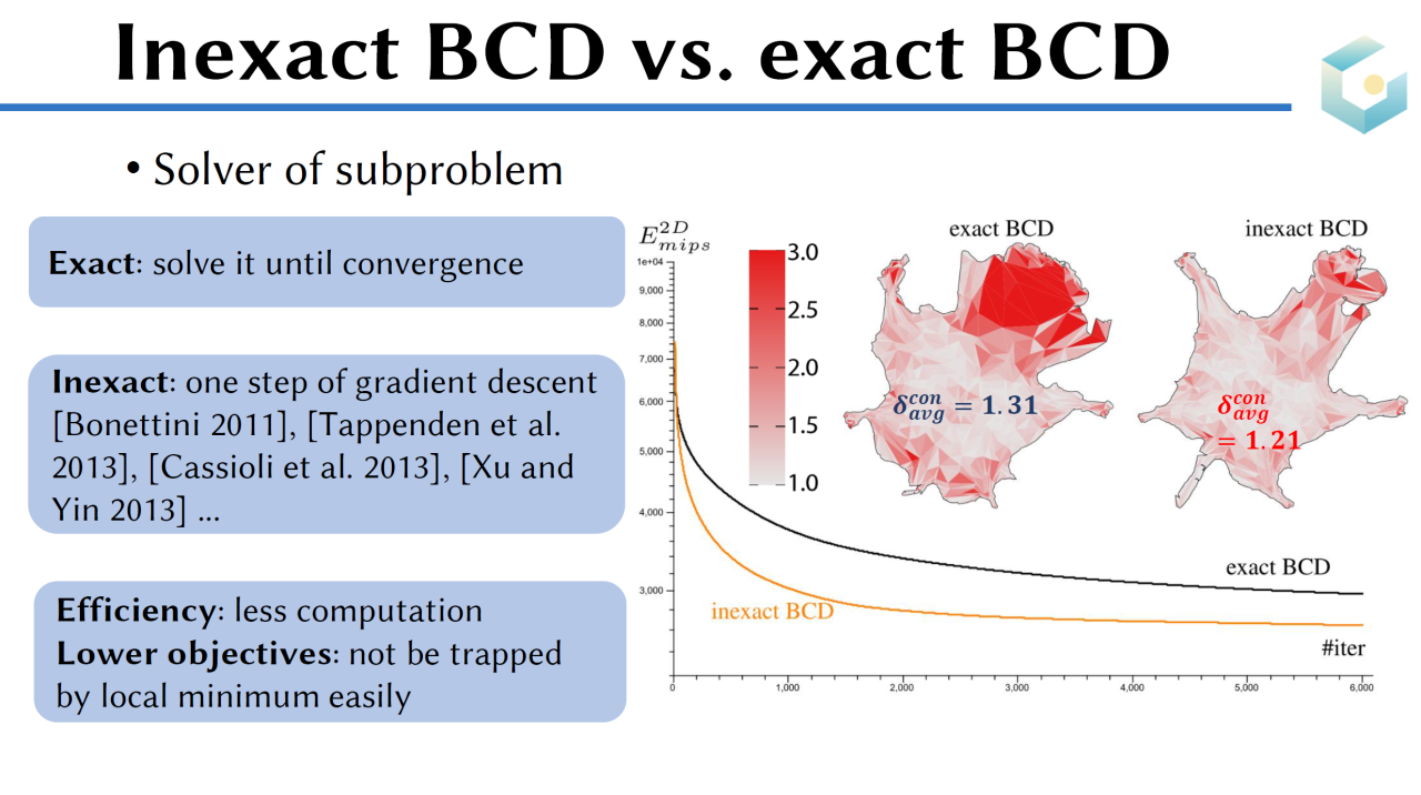 在更新顶点坐标时根据是否优化至当前最优值BCD还可以分为exact和inexact两种方法。在exact方法中每次更新顶点都会不断求解直到收敛,而inexact则只需要保证目标函数能够减少即可。实践结果显示inexact方法只需要更少的计算资源,而且往往能够得到更小的最终优化结果。