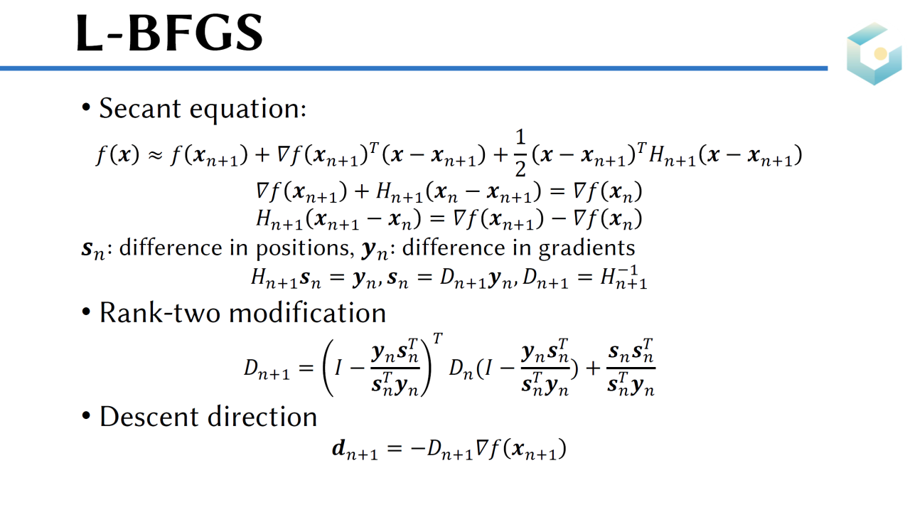 \[H_{n+1} \mathbf{s}_n = \mathbf{y}_n \Rightarrow \mathbf{s}_n = D_{n+1} \mathbf{y}_n\]其中\(D_{n+1} = H_{n+1}^{-1}\)。在L-BFGS中使用rank-two修正来估计\(D_{n+1}\):
