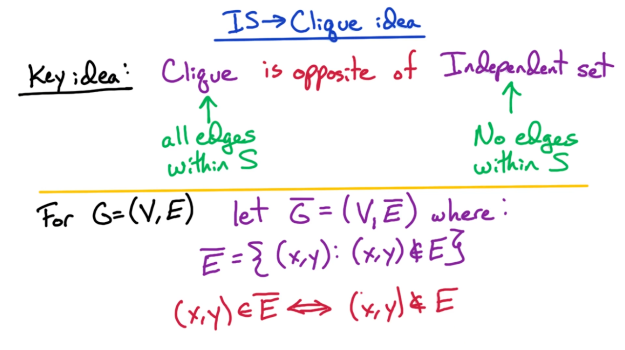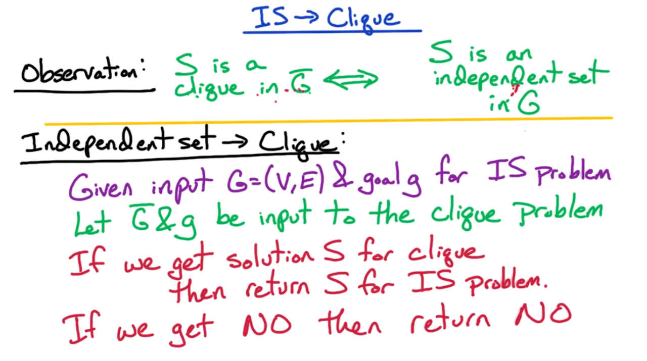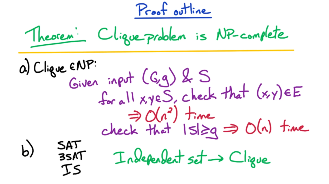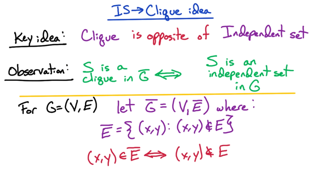 显然团搜索问题是一个NP问题,我们只需要验证团中的每一对顶点是否相连即可。而在第二步则可以将独立集问题归约到团搜索上来进行证明,实际上独立集与团搜索是相互对立的。