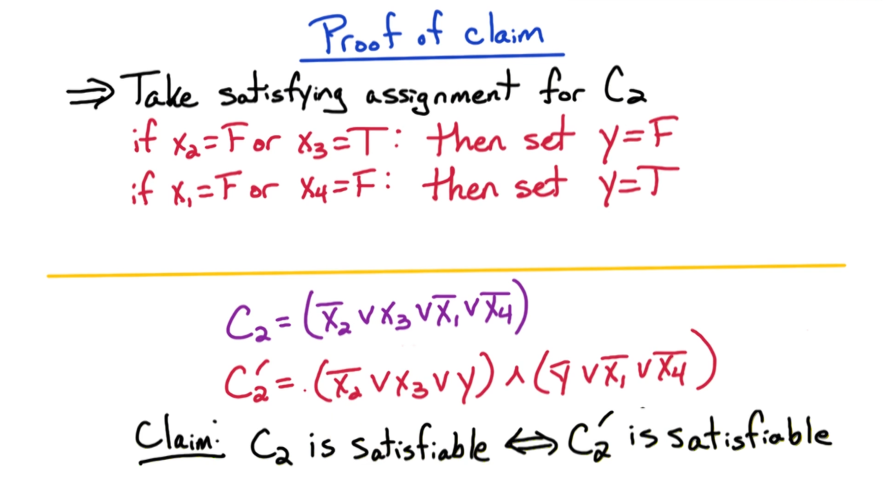 \[C' = ( \bar{x}_2 \vee x_3 \vee y ) \wedge ( \bar{y} \vee \bar{x}_1 \vee \bar{x}_4 )\]可以证明$C$和$C’$是等价的,这样一个4SAT问题就转换成了3SAT。