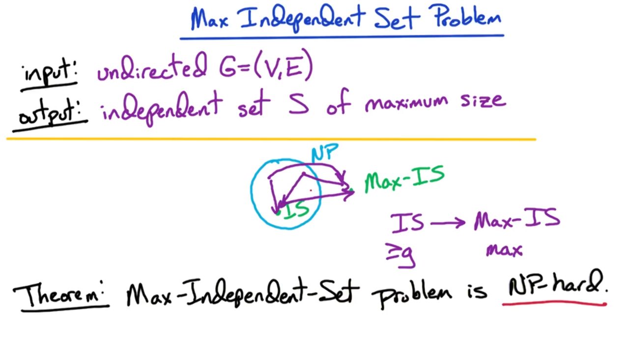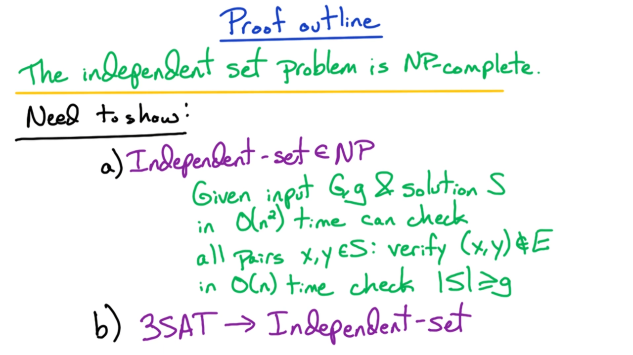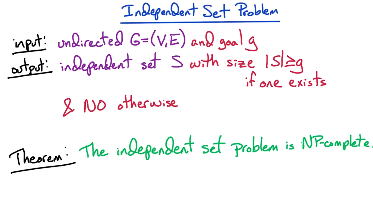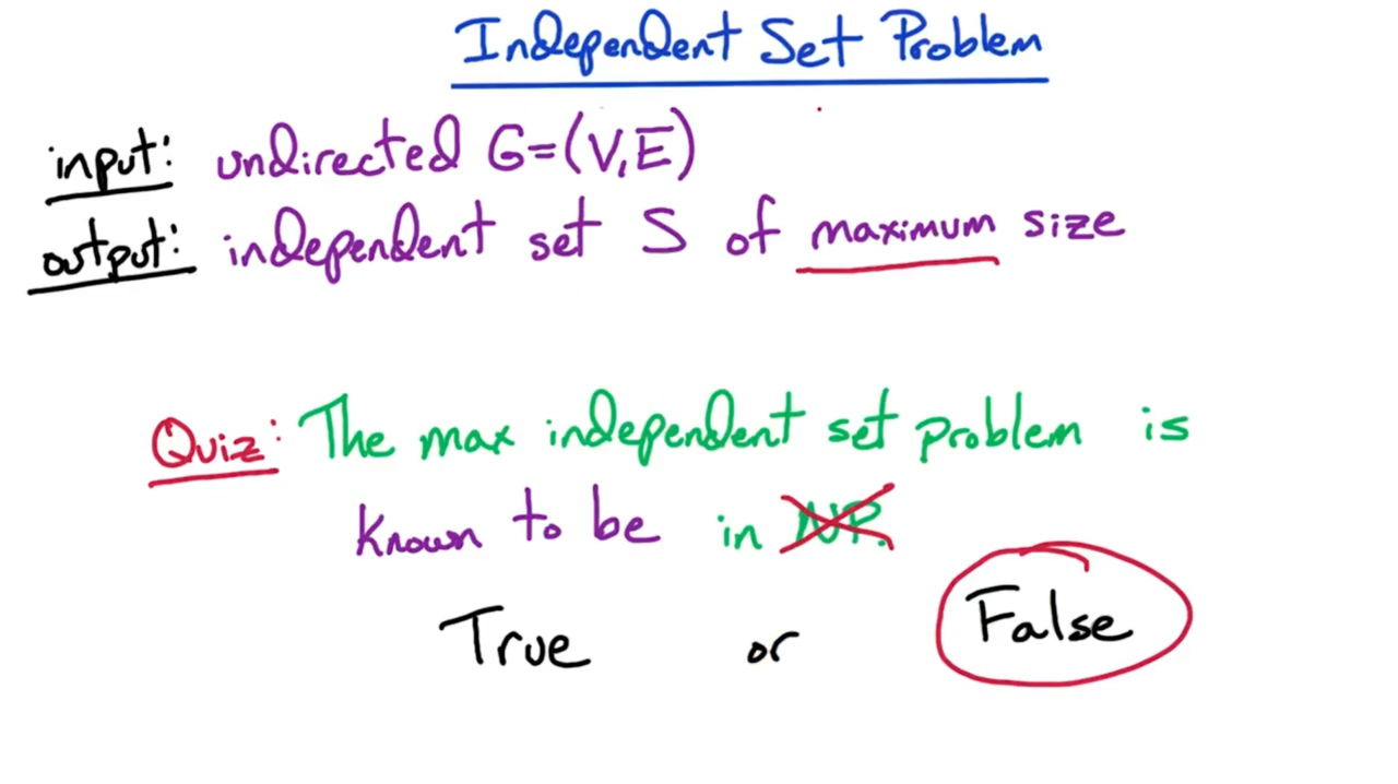 实际上寻找图上的最大独立集不是NP问题。不过我们可以对它进行一些修正,只要求独立集中顶点的数量大于g,此时的独立集问题是一个NP完备问题。