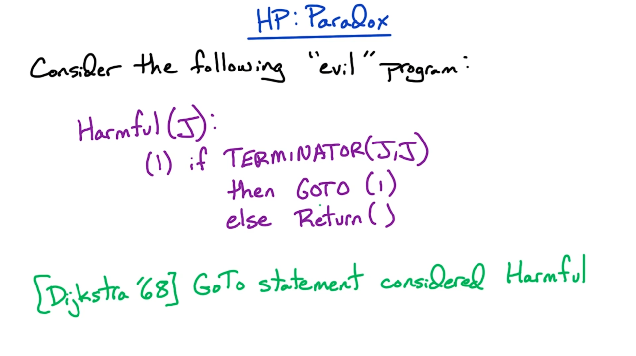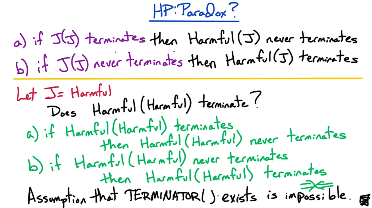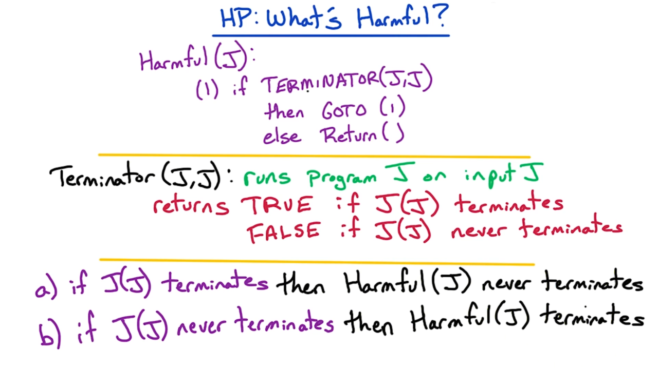 显然如此构造的程序Harmful(J)在TERMINATOR(J, J)为True时会无限循环下去,而在TERMINATOR(J, J)为False时终止运行。