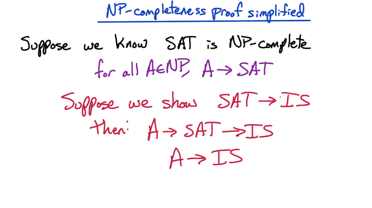这样我们就证明了独立集问题是一个NP完备问题。回到最大独立集的问题,利用归约可以证明最大独立集问题至少和独立集问题一样难。因此对于最大独立集问题我们称其为NP-hard,表示它至少和任意NP问题一样困难。如果能够找到NP-hard问题的多项式时间解法,那么所有的NP问题都可以在多项式时间内解决。