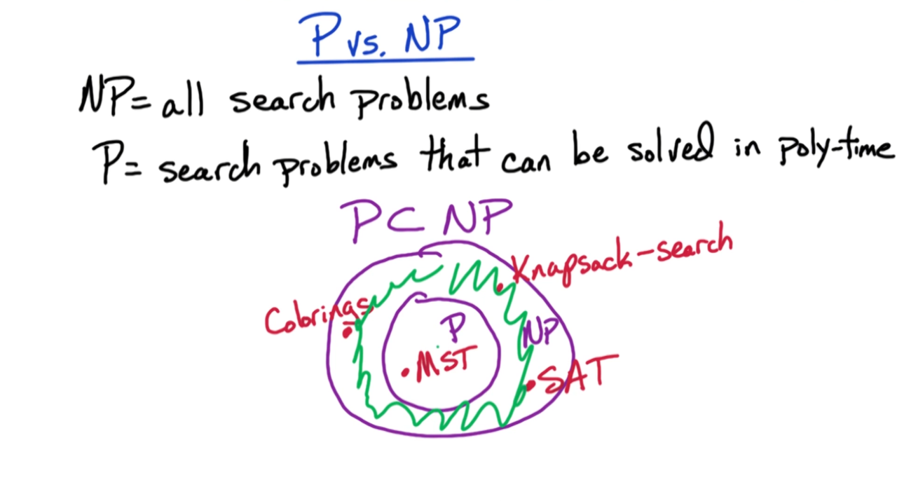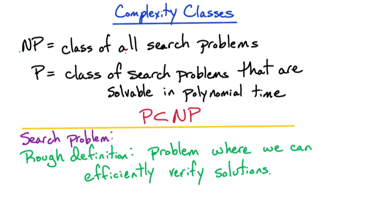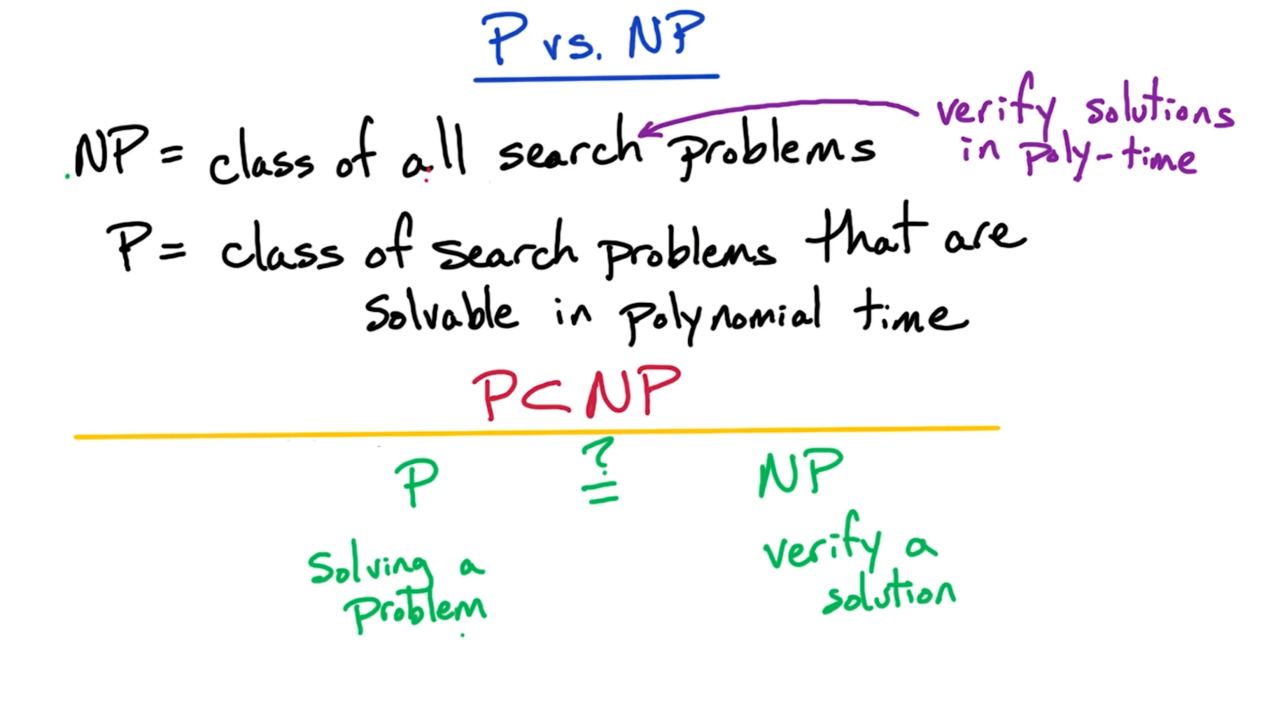 我们定义NP问题是所有搜索(search)问题的集合,这里搜索是指可以在多项式时间内对它的解进行验证的问题。而P问题则是指可以在多项式时间内进行求解的搜索问题集合。显然P问题是NP问题的一个子集,这是因为能在多项式时间内求解的问题必然能在多项式时间内进行验证。