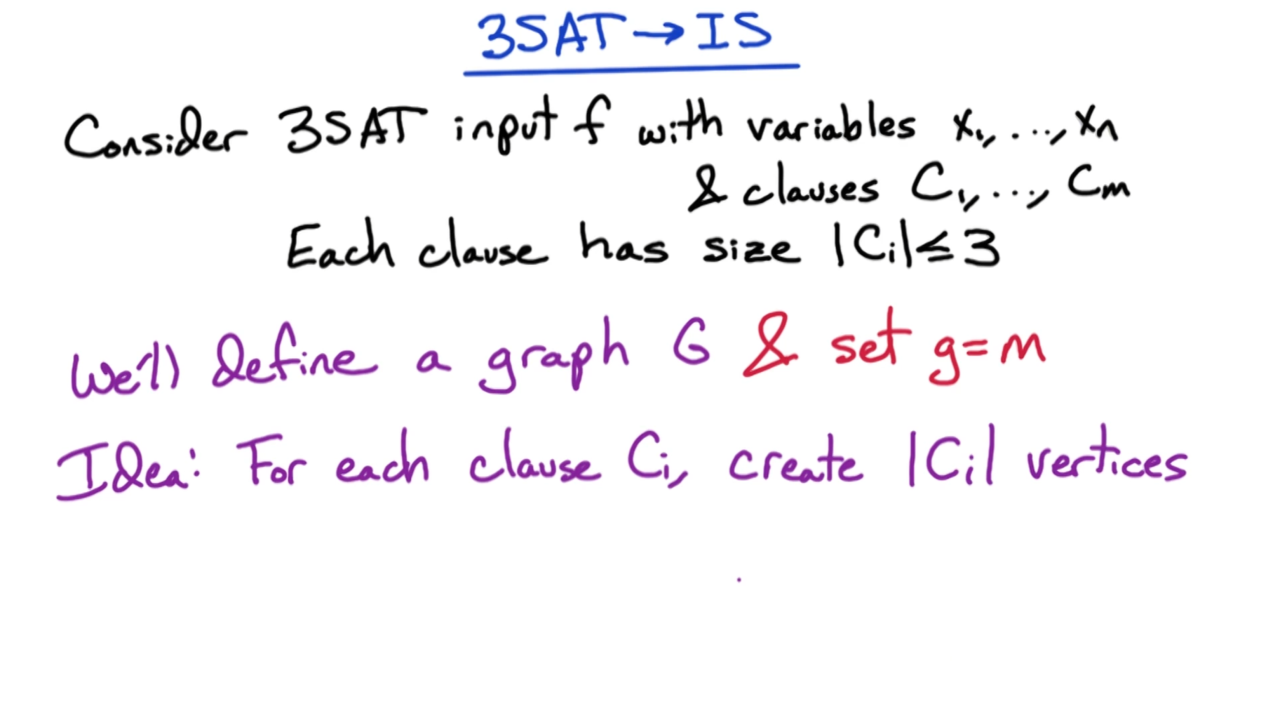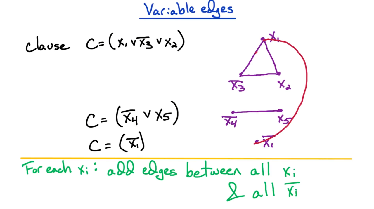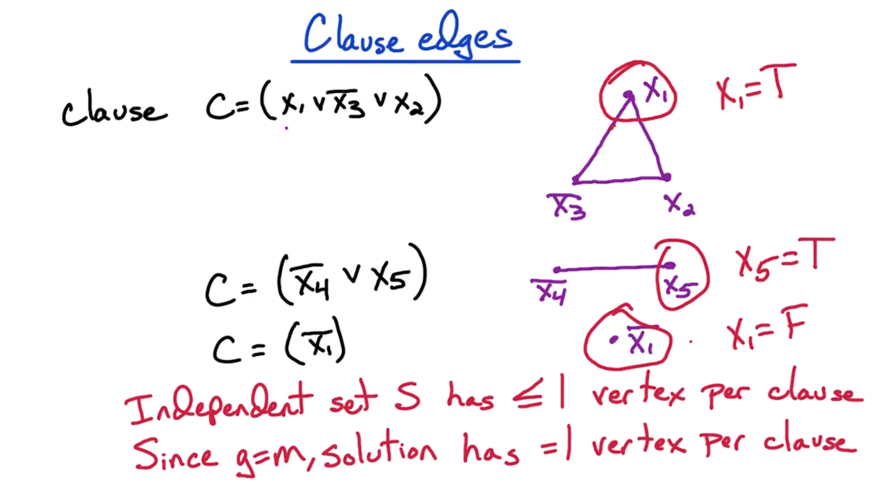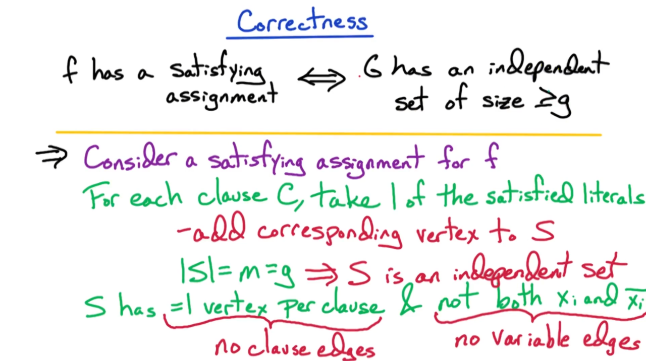 接下来证明3SAT问题可以归约到独立集问题上。首先我们把每个从句转换成图上的一个团,然后为任意包含互斥变量的顶点对添加一条边。这样求解3SAT问题就转换为了在图上寻找独立集的问题。