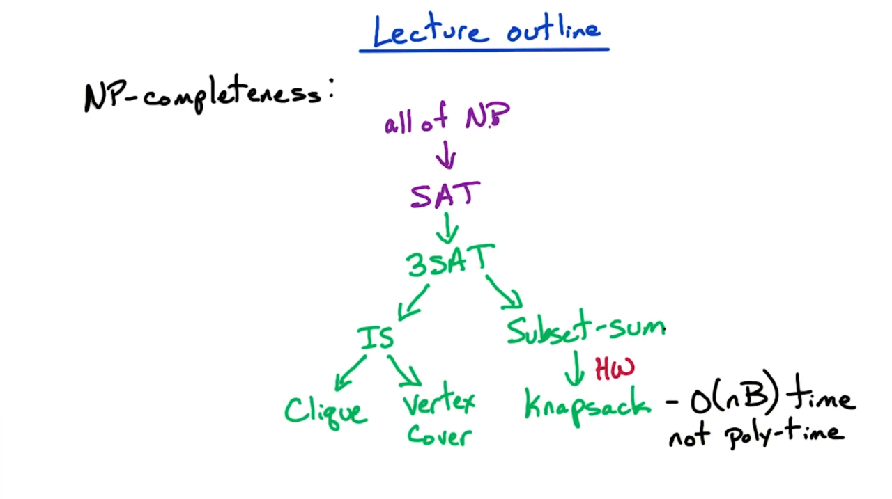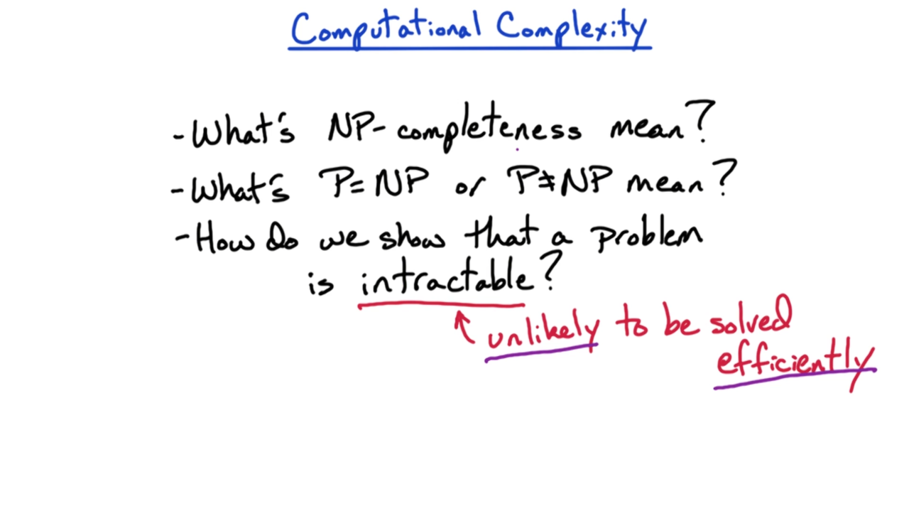 在本节课中我们会介绍NP完备(NP-completeness)的概念、P=NP以及P≠NP的意义、以及如何证明一个问题是难以求解(intractable)的。